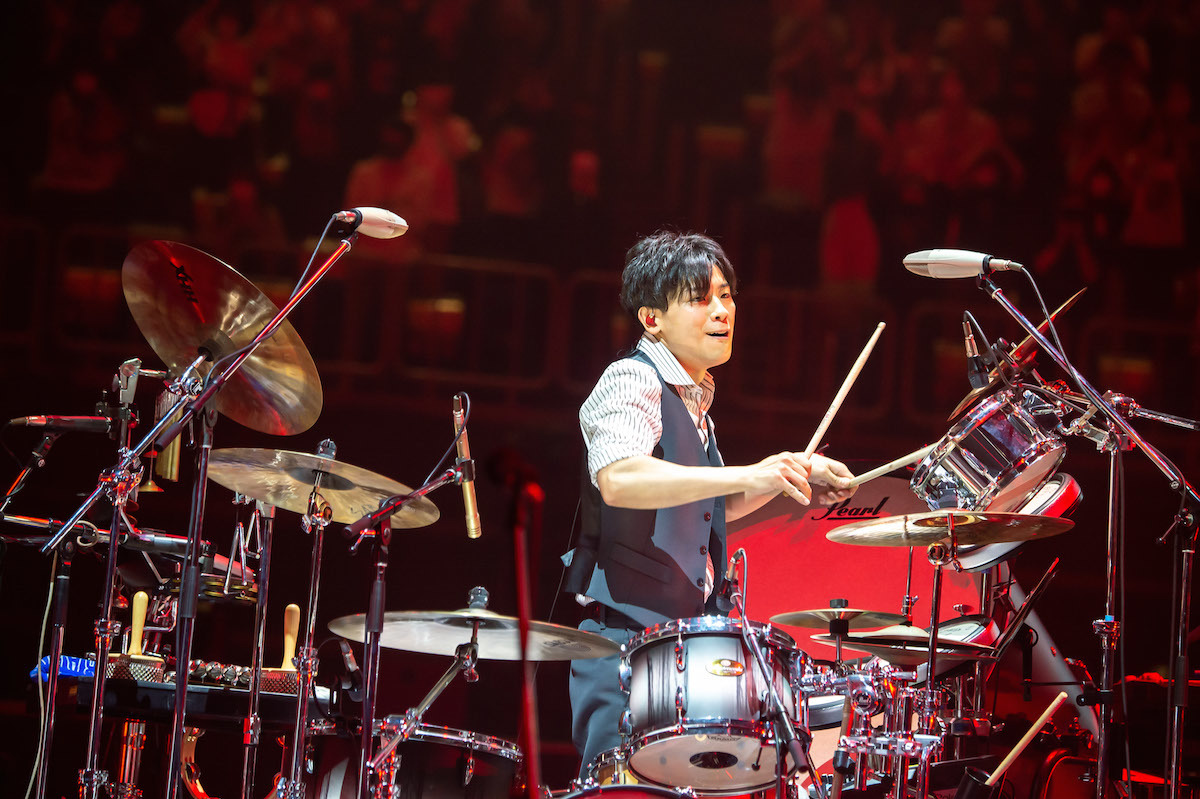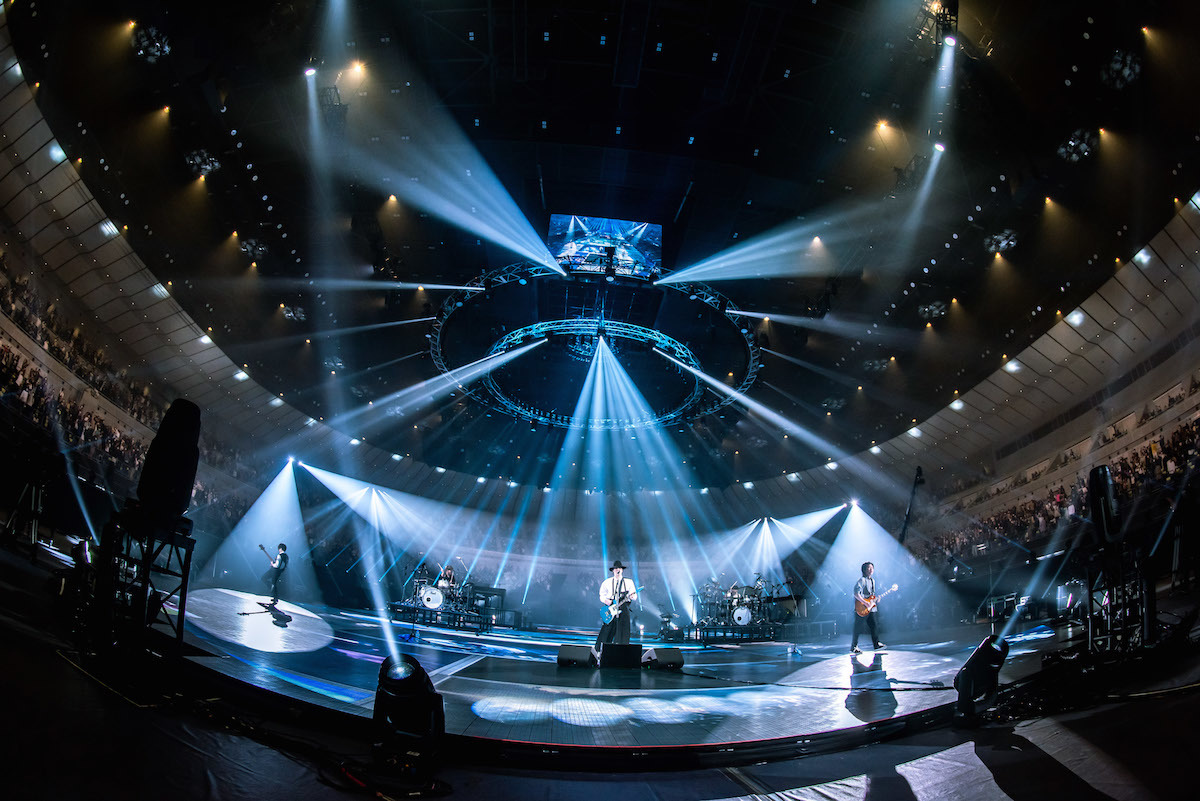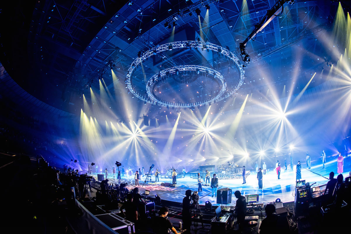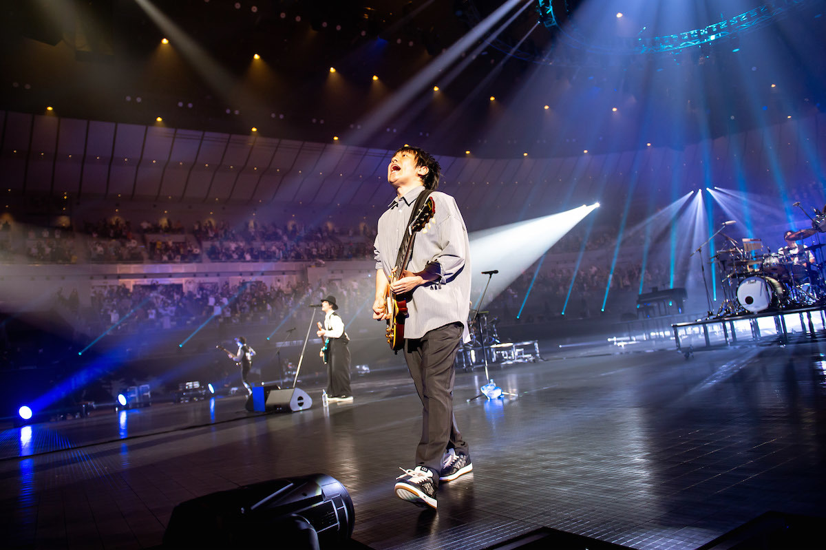 横浜アリーナのセンターフロアを丸々使用した広大なステージを、アリーナ席とスタンド席から360°のオーディエンス(ソーシャルディスタンスにも配慮)が取り囲み、熱い視線を送る会場レイアウト。頭上のスクリーンには、街ゆく人々が一様にマスクをした姿の、コロナ禍の風景を用いたイントロ映像が流れる。会場オーディエンスには、歓声や歌といった大きな声を出さないよう求められているけれども、温かな拍手に迎えられた野田洋次郎(Vo/Gt/Pf)、桑原彰(Gt)、武田祐介(Ba)、そしてツインドラムのサポートメンバーにはお馴染みの森瑞稀と、初参加となる繪野匡史(エノマサフミ)が加わり、静謐なサウンドで「タユタ」を切り出す。メンバーの足元にはCO2が立ち込め、幻想的で美しい視界だ。