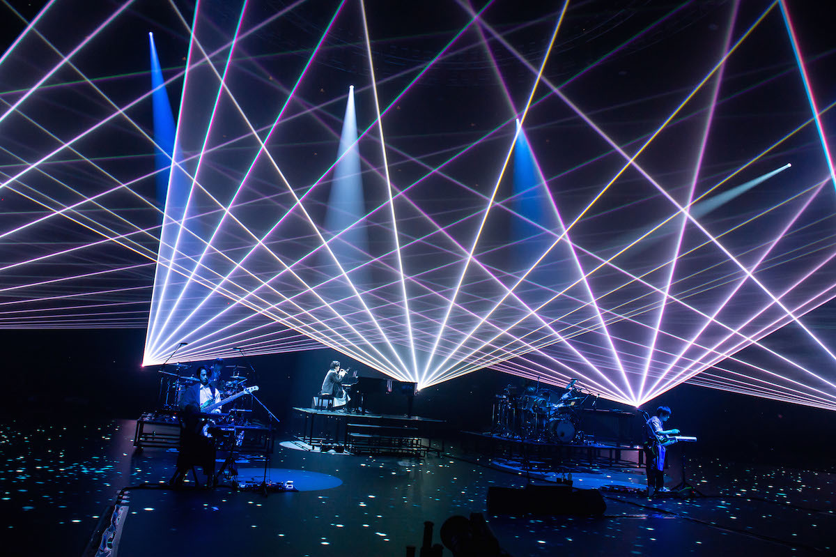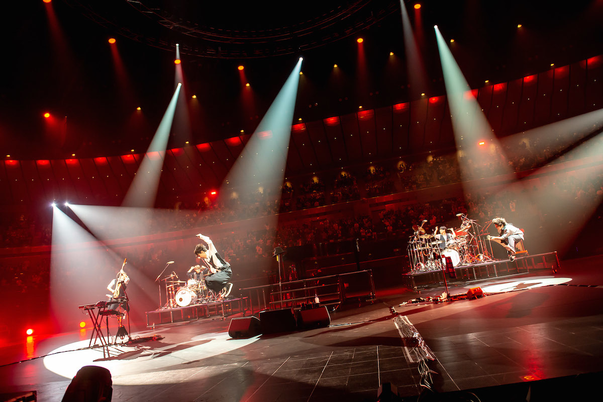 続いて、背後からの照明にシルエットを浮かび上がらせながら「グランドエスケープ」のピアノイントロを奏でる野田。のっけから大音量で叩きつけるというよりも、今の世界にじっくりと音楽を染み渡らせてゆくライブになっている。ここで、広いステージに幾つかの光の粒が現れ、数を増しながら次第に中央に寄り集まってきた。なんと、ステージの床全面がLEDのスクリーンパネルに覆われており、さまざまな映像演出がもたらされる仕掛けになっているのだ。まるで銀河の星々の中を駆け抜けてゆくような視界の中、オーディエンスの手拍子に後押しされたRADWIMPSは、あらゆるしがらみを断つ解放のコーラスへと傾れ込む。桑原や武田も、凛と正面を見据えて歌っていた。