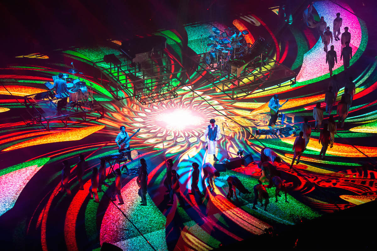 勇敢な航海に乗り出す「NEVER EVER ENDER」ではステージの床が海のように波打つポリゴンCGの演出が持ち込まれ、野田が指揮者のように振る舞う「おしゃかしゃま」の恒例バトルセッションが熱狂を育む。「G行為」では、妖しいバンドグルーヴの中で怪物のように肥大化した自意識を、前衛的なダンスで視覚化するダンサー陣(振付監修は吉開菜央)の活躍が素晴らしい。「花火大会」と題されたダンスパフォーマンスを経る間に、野田、桑原、武田の3人はシックでエレガントな内装が施された別室へと移動。桑原のマンドリンや武田のウッドベースが柔らかく美しい音色を奏でる“お風呂あがりの”を披露し、エレクトリック編成でプレイされる“やどかり”ではダンサー人とパレードを繰り広げるようにメインステージへと帰還を果たす。聴覚も視覚も、そして心も満たされるライブだ。