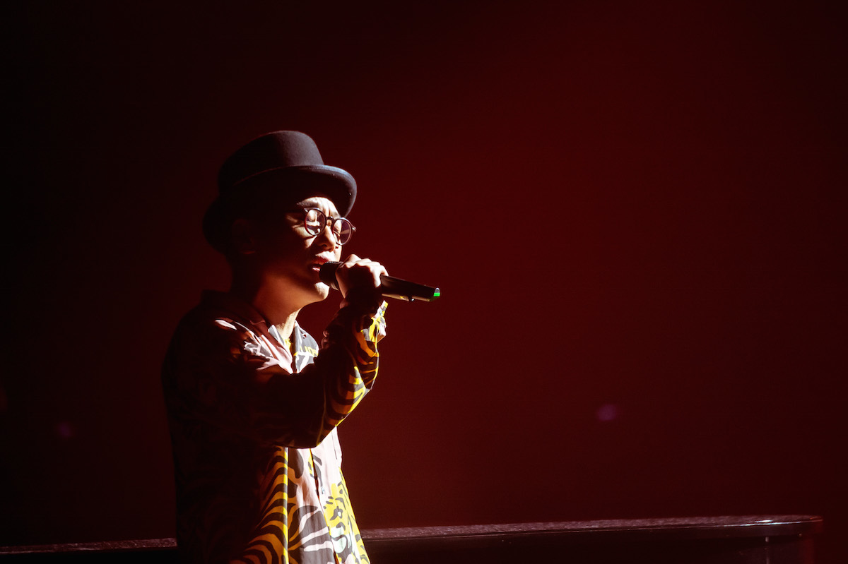 そんなふうに重く、しかし大切な言葉に続いて披露された「棒人間」では、野田のピアノを取り囲むように立っていたダンサー陣の影法師が一人でに踊り回るという不思議な映像演出が用いられ、歌のフィニッシュと同時に実体と影法師がひとつに重なる。「螢」は、ダンサー陣の手にしたペンライトの光が螢のように舞い、また吊り下げられた無数のLEDがコンピューター制御によって宙空に模様を描き出すドットイメージの演出も美しい。「告白」そして「記憶を呼び起こす瀧」と題されたドットイメージの時間に続いては、「トレモロ」に「有心論」、そして渾身のシャウトも飛び出す「ます。」と、エモーショナルな人気曲の連打で再び加熱していった。あらためてオーディエンスに感謝の思いを伝え、またライブの総指揮を担った谷聰志をはじめ大勢のスタッフへの拍手を促すと、本編は幽玄のサウンドに包まれた「バグッバイ」のメッセージで締め括られる。