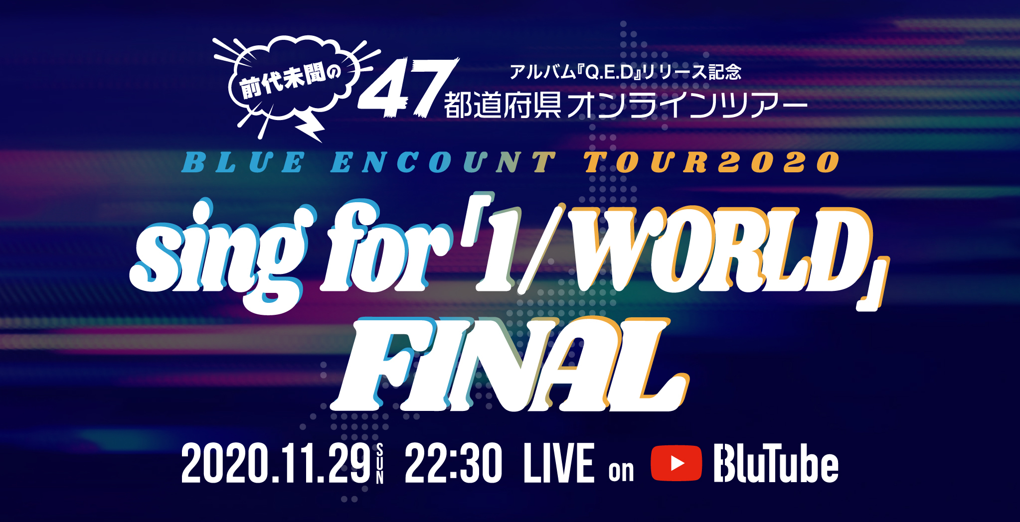 BLUE ENCOUNTが、11月28日(土)、29日(日)の2日間に渡って行うオンライン上で47都道府県を周るライブツアー企画 『BLUE ENCOUNT TOUR2020 -sing for 「1/WORLD」-』。その48本目のツアーファイナル公演がYouTube LIVEにて生配信されることが決定した。