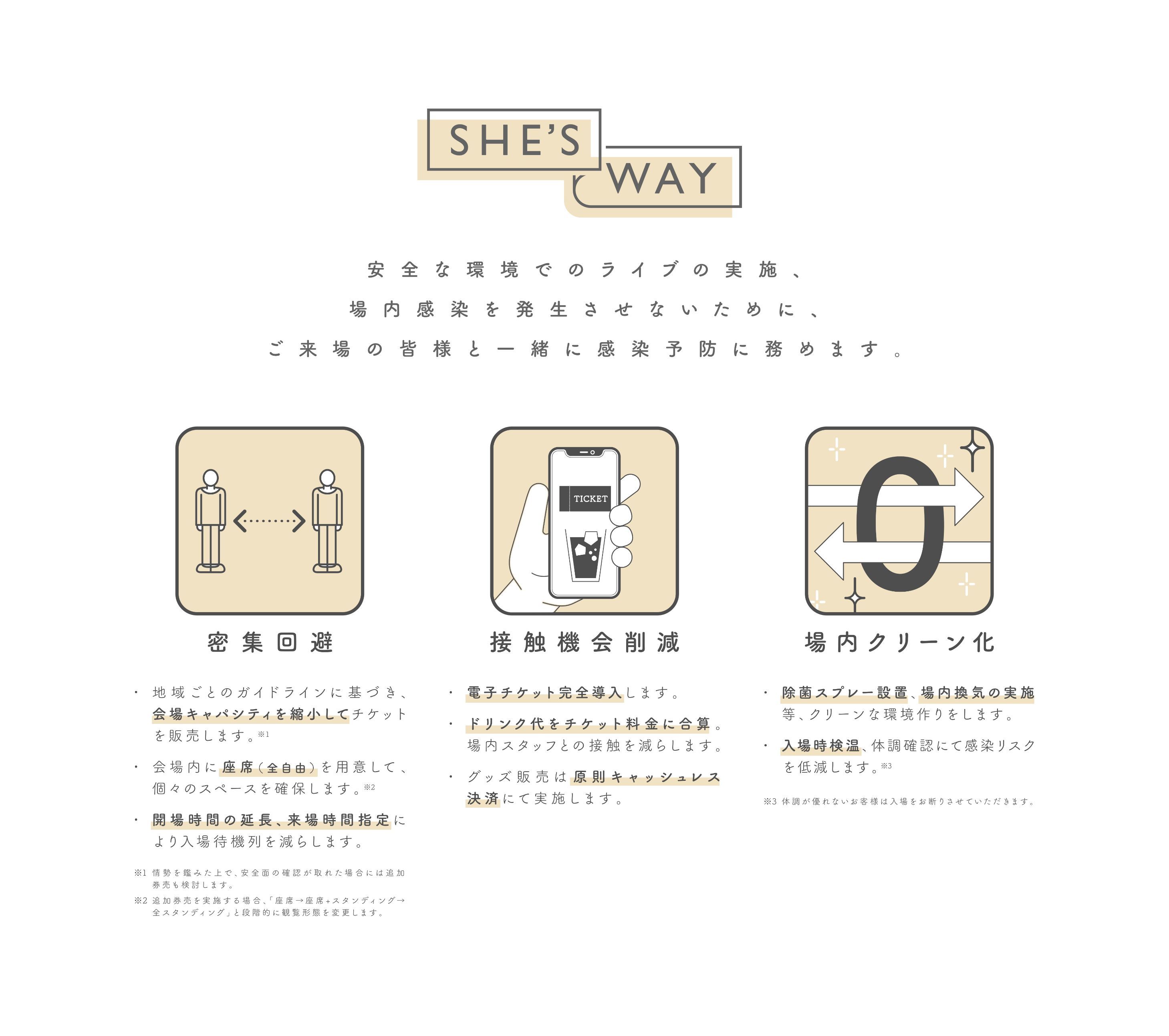 また、今回の生配信には、SHE’S初となる“マルチアングル形式”が導入される。これは、複数台のカメラアングルの中から自由に選択・切替えができるサービス。視聴者は、それぞれが自分の好きな映像に切り替えながらでライブを視聴することができる。