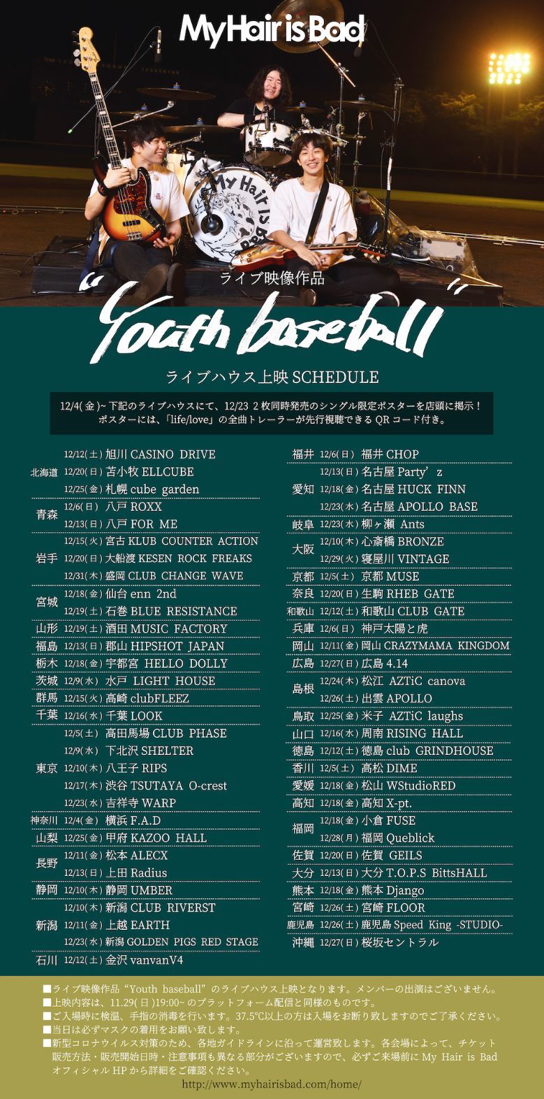 本日11月29日(日)から配信がスタートしたMy Hair is Badのライブ映像『My Hair is Bad ライブ映像作品「Youth baseball」』の上映イベントが全国59のライブハウスにて開催されることが決定した。