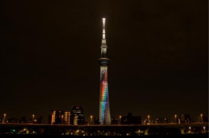 NiziUのデビューシングル「Step and a step」のリリースを記念して、東京スカイツリー(R)がNizi(虹)をイメージした特別ライティングを点灯する。