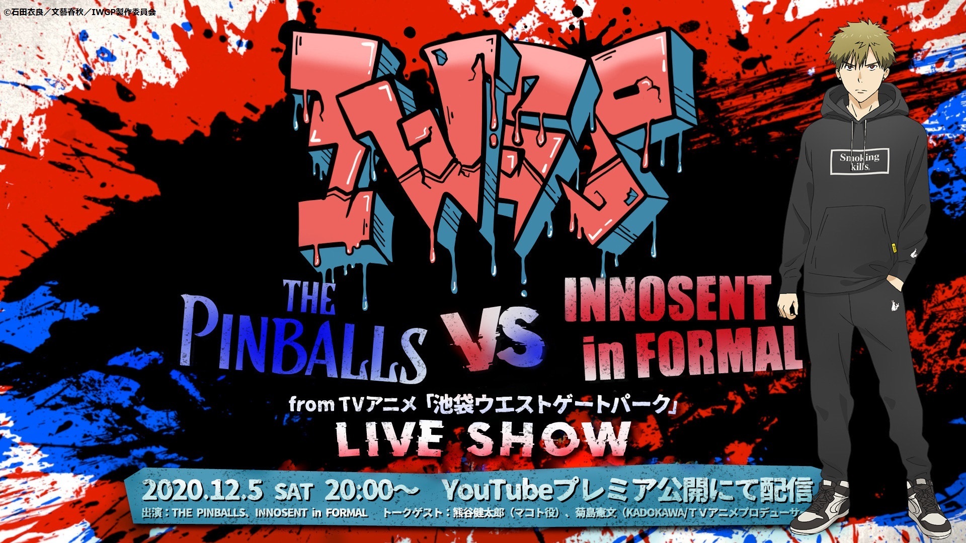 TVアニメ「池袋ウエストゲートパーク」の放送を記念し、OP主題歌を担当する「THE PINBALLS」とED主題歌を担当する「INNOSENT in FORMAL」の2バンドによるガチンコのライブ映像が、12月5日(土)20時よりYouTubeプレミア公開されることが決定した。