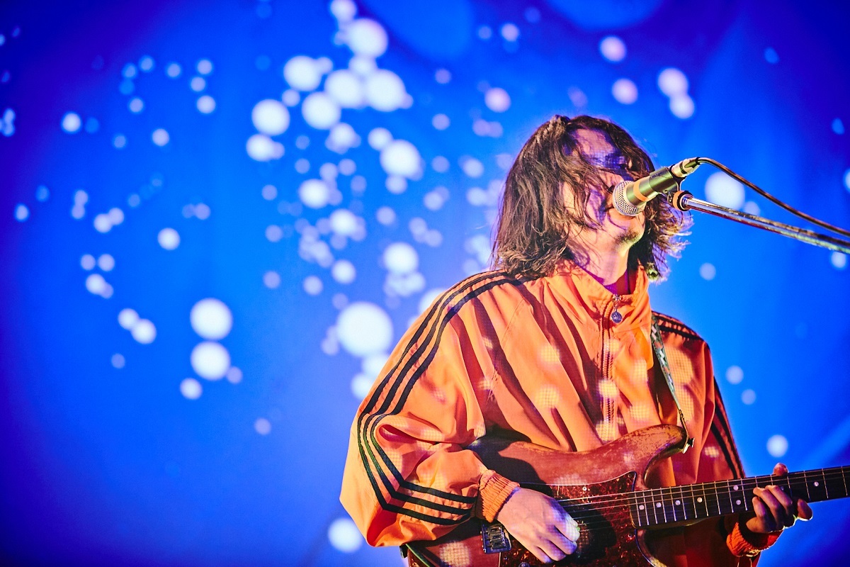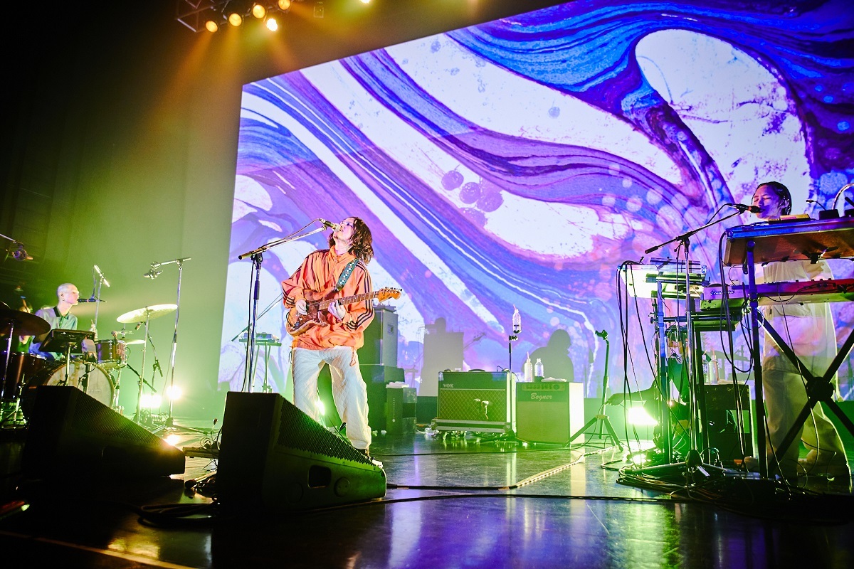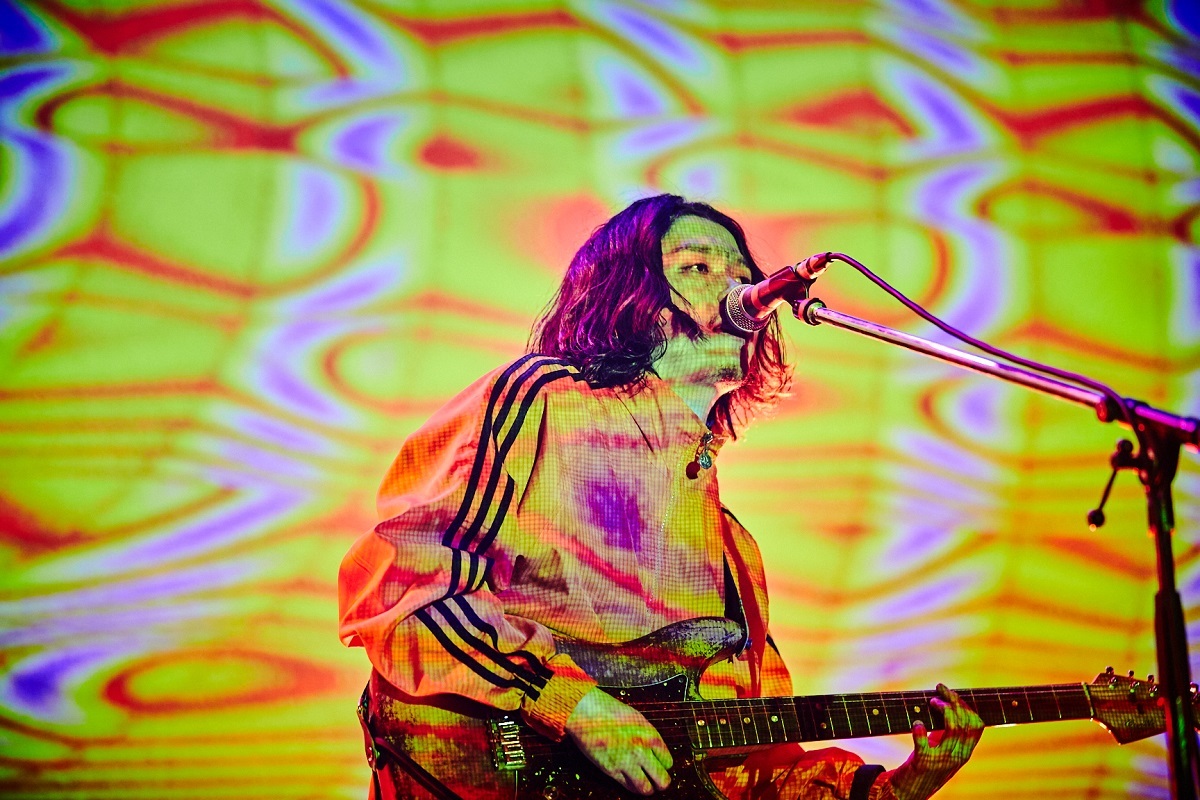 「こんにちは!」「Tempalayです!」というサンプリングのフレーズにディレイがかけられ、スクリーン上で揺れるバンドのロゴと同期するという演出に続いては、以前BTSのRMがSNSでピックアップしたことでも知られる「どうしよう」。中盤は初期の楽曲が続き、アトモスフェリックなシンセから始まるドリームポップ調の「Festival」では、ダブな展開で小原が逆回転ギターを弾き、轟音とサイケな映像の組み合わせが陶酔感を誘う。