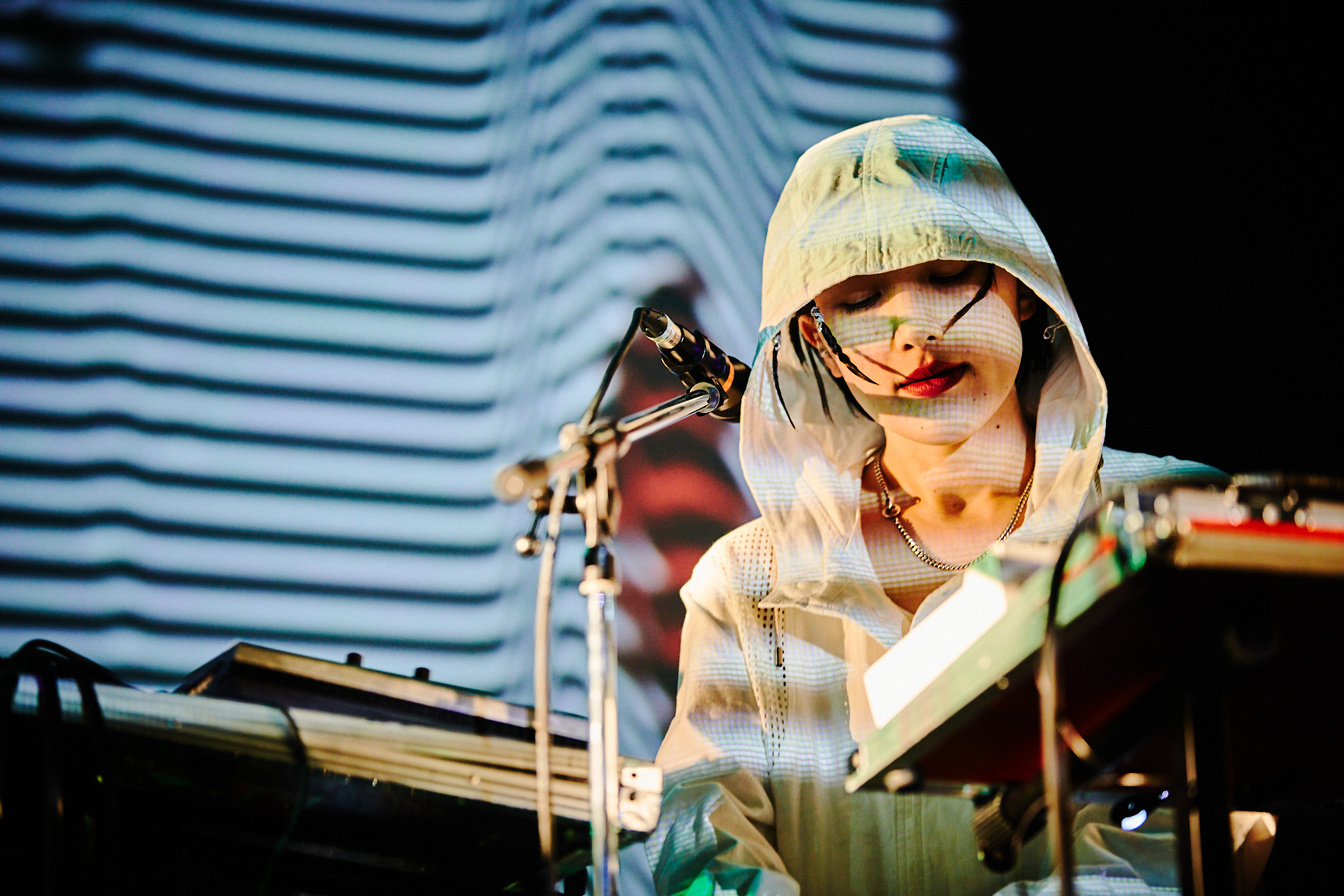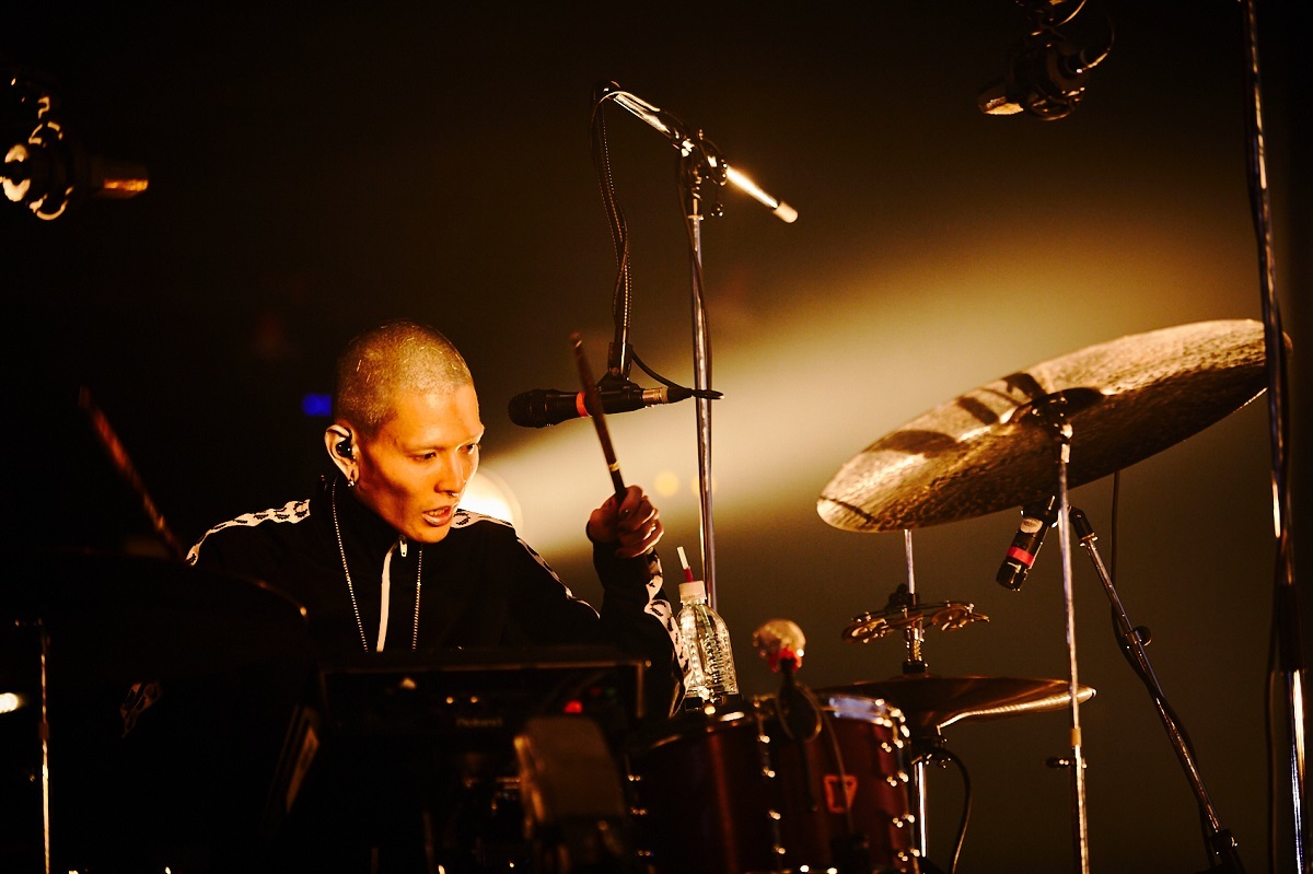 ノイジーなSEとともにステージ前方の幕が開き、メンバーが姿を現すと、ドープな雰囲気の「脱衣麻雀」でライブがスタート。AAAMYYYはフードの上からヴェールを被って顔を隠し、John Natsukiは坊主頭にサングラスという風貌で、曲調も含めミステリアスな雰囲気を放つ。しかし、後半から一転してファンキーなリズムに変わると、フロアの空気も変わり、小原綾斗の骨太なギターリフをフィーチャーした「SONIC WAVE」へとなだれ込んでいく。