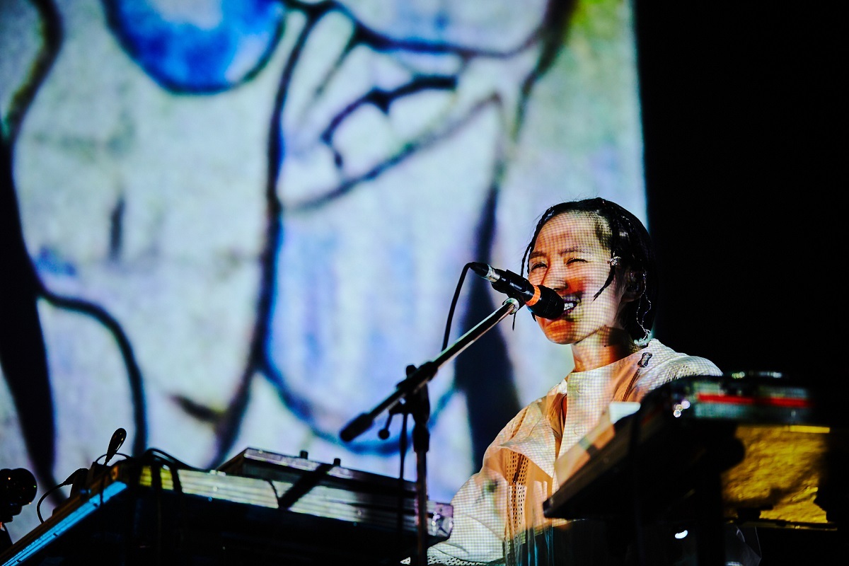 モノクロの映像とともに演奏された「深海より」から、宇宙人の声を模した声がモンドな雰囲気を作り出す「カンガルーは考えている」では、後半のシューゲイズなノイズパートでストロボがたかれ、恍惚とした状態に。さらに、二胡の音色で始まった「大東京万博」は加工が施された東京の夜景をバックに演奏され、そこはまさにオリエンタルな異空間。「らっせーららっせーら」の大合唱から、小原が軽快なステップとともにノイズギターを奏でると、ラストは「そなちね」での絶叫とともに本編が終了。お決まりの「次で最後の曲です」というMCもなく、スパッと潔く終わるのも実に彼ららしい。