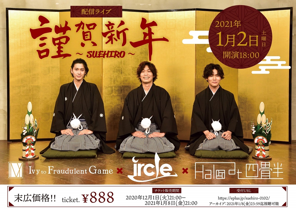 ircle、Halo at 四畳半、Ivy to Fraudulent Gameという同じ事務所に所属する3組が、2021年の年明け、1月2日(土)に配信ライブを開催することが決定した。