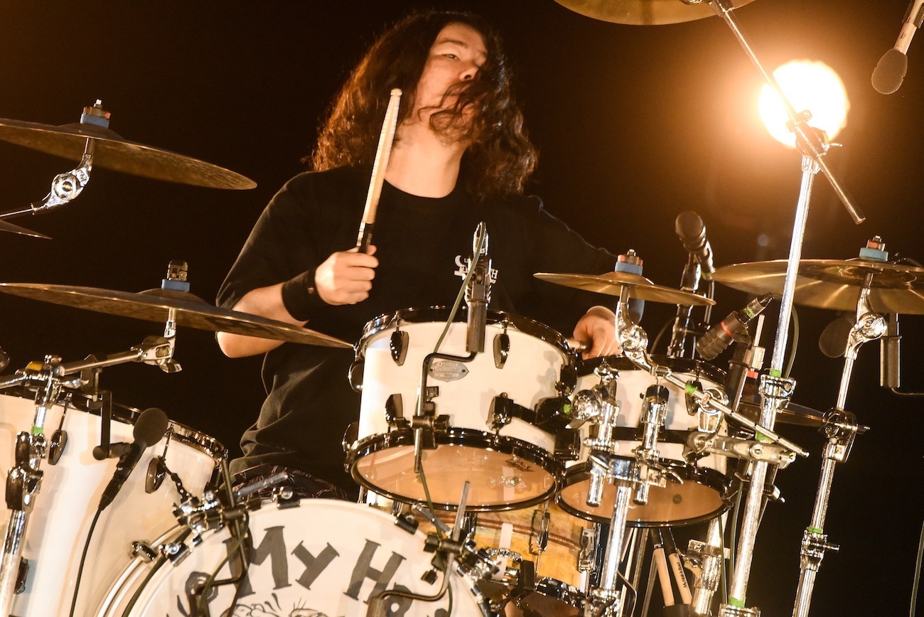 緊急事態宣言中も、いつライブができるようになってもいいように、気持ちを切らさないように、個人練習や体力維持に努めていたという山本大樹(Ba.Cho)は、自粛期間前とまったく変わらぬ重心の低いフォームで曲のボトムを支える。同じく、コンディションを落とさないように筋トレに励んだ結果、体重が10キロ落ちたという山田淳(Dr.)は、My Hair is Badのホームであるライブハウス、上越EARTHのTシャツ姿で、時にどっしりと、時に前のめりに荒々しく、ビートを刻み続ける。
