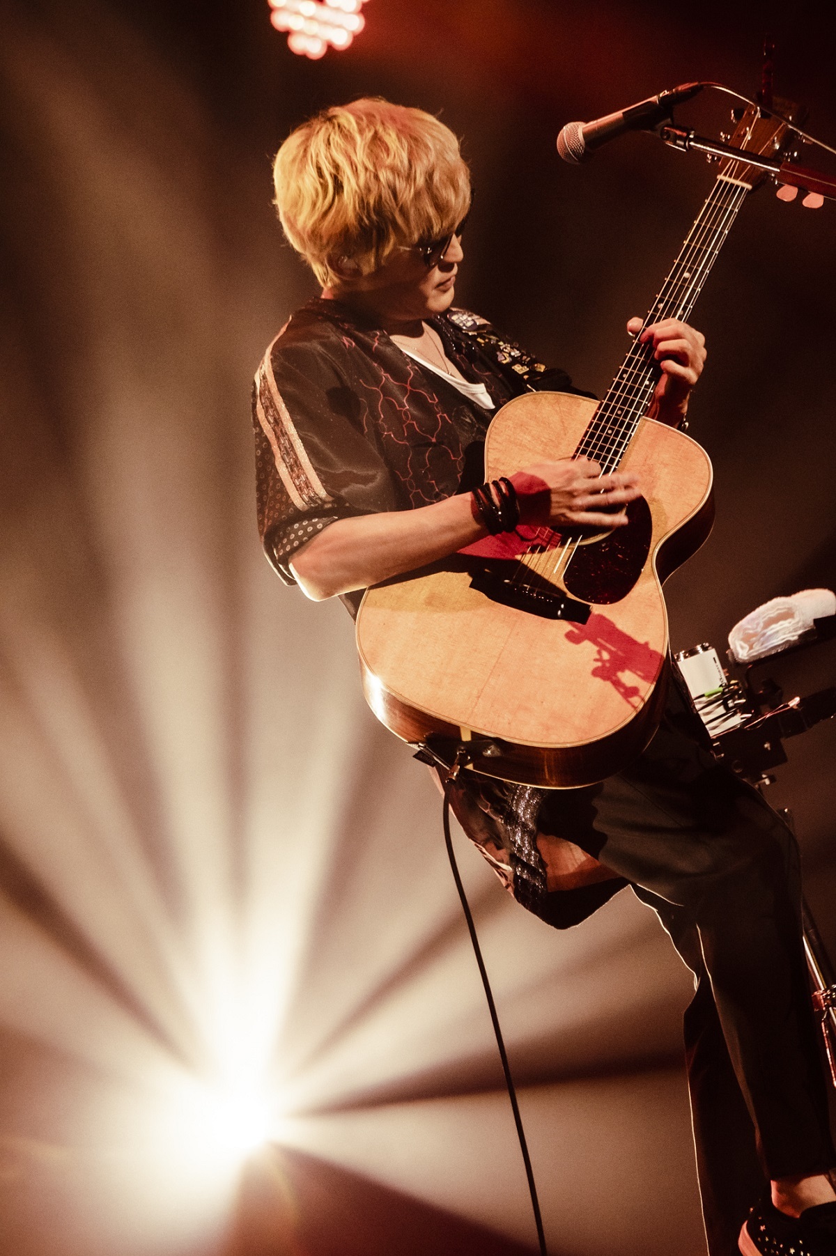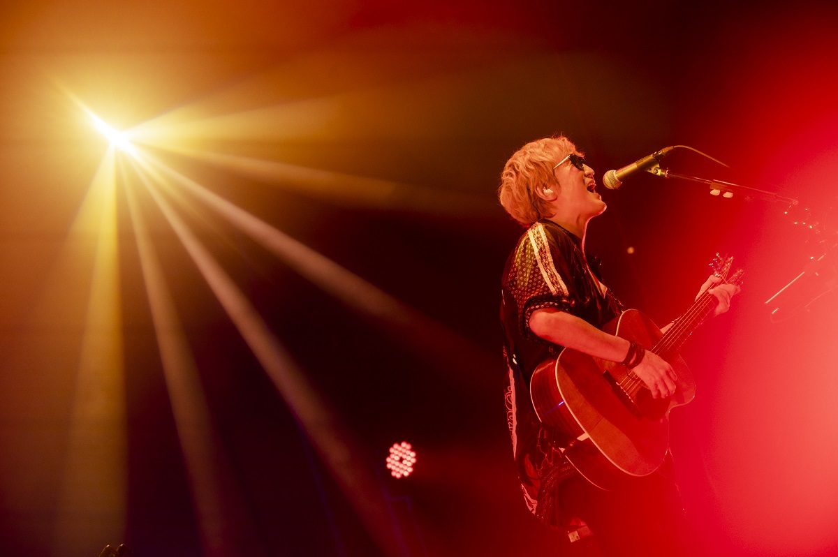 ウクレレに6本の弦を張った「ギタレレ」に持ち替えて歌った「サヨナラホームラン」は、自ら振り返るコロナ禍での生活と奇妙にシンクロする1曲。そこから「黄昏ギター」「Hop Step Dive」と続けた3曲は、ひとりの部屋でうつむいていた男が立ち上がりギターをつかみ、希望の未来へ歩き出すさまを描く、まるで3部作のように響く。アコギ1本だから歌がよく聴こえる、歌詞がよく聴こえる、メッセージが深く伝わる、それが『Hitori Sugar Tour』の醍醐味だ。
