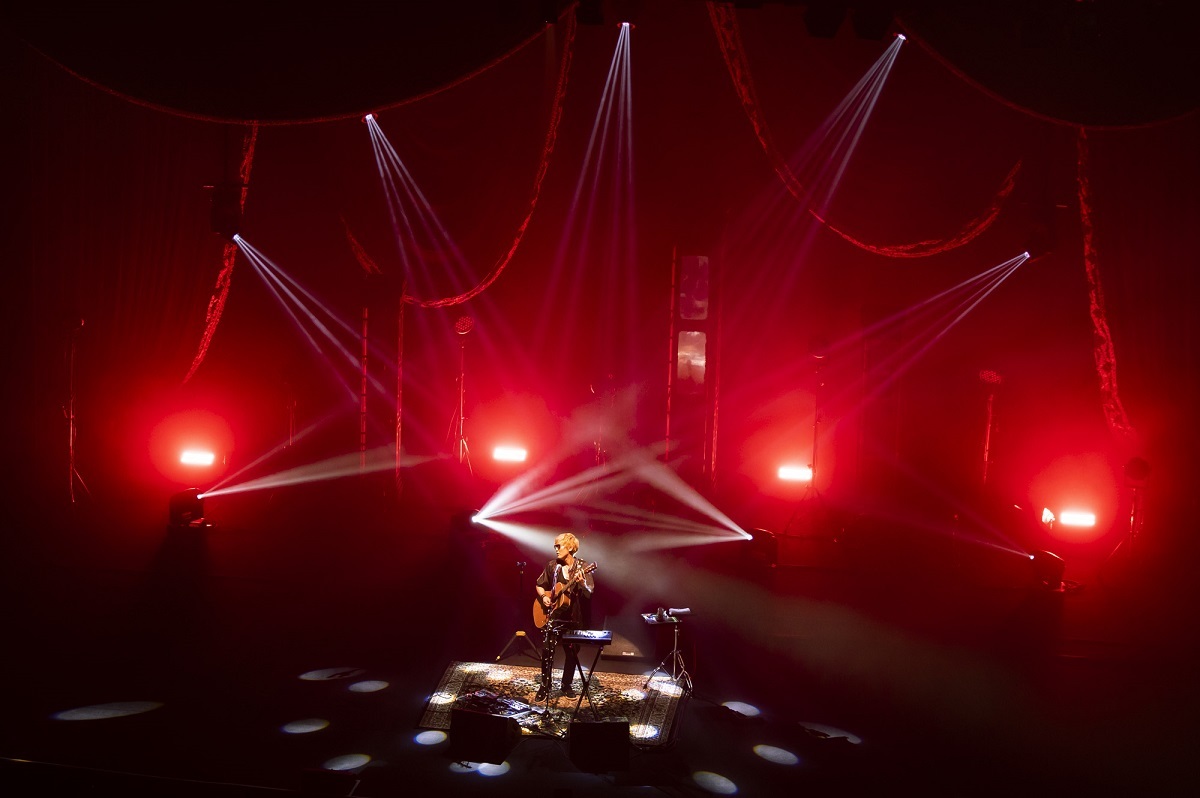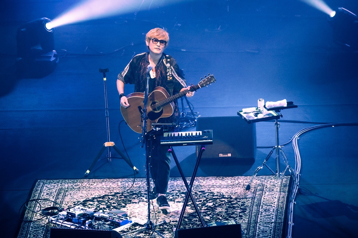 エフェクターやサンプリングマシーン、足で操るフットパーカッションなど、機材をひととおり紹介したあと、早速ギターのボディを叩く音をサンプリングしてビートを刻む「午後のパレード」へ。ステップを踏みながらステージ前に躍り出たり、わざと歌を止めて観客の反応を煽ったり、伸び伸び歌う姿を見るだけで嬉しくなる。フォーキーなのにグルーヴィーな、「真夜中の虹」を聴きながら自然と体が揺れてくる。