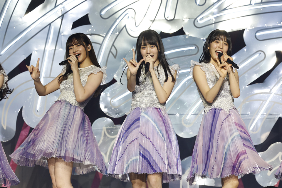 オープニングとなる1曲目は「君の名は希望」。かつて生駒里奈がセンターを務め、『NHK紅白歌合戦』初出場時にも披露された代表曲を、次世代の四期生が熱くパフォーマンスした。その後、「命は美しい」「インフルエンサー」「走れ!Bicycle」「ガールズルール」といったヒット曲中心のオンパレードから、四期生の遠藤さくらがセンター、両サイドに賀喜遥香・筒井あやめと四期生メンバーがフロントを担った24thシングル「夜明けまで強がらなくてもいい」で頭のブロックを締め括った。