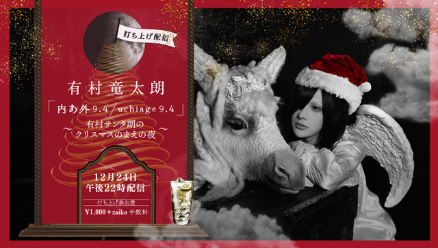 また、『X’mas Live Streaming「月令 9.4/ getsurei 9.4」』終演後には、恒例の打ち上げの様子を生配信する『「内あ外 9.4 / uchiage 9.4」~有村サンタ朗のクリスマスのまえの夜~』を実施する。
