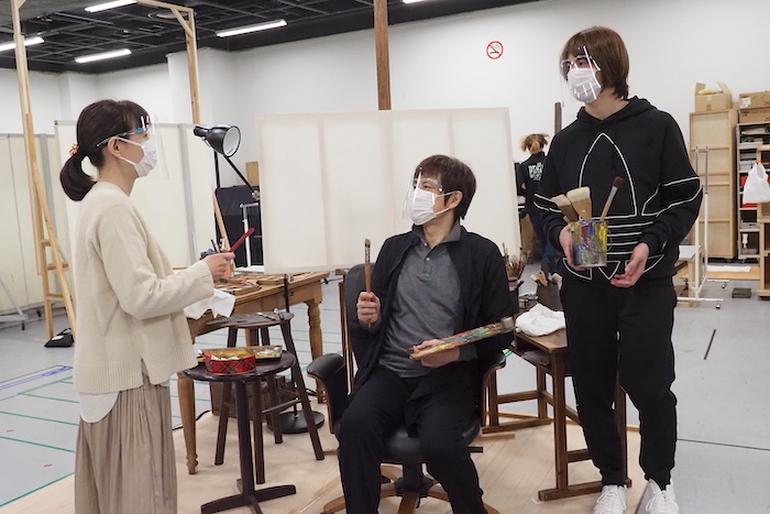 12月12日開幕の『オトコ・フタリ』稽古写真 (保坂知寿、山口祐一郎、浦井健治)。マスクとフェイスシールドをつけた上で、稽古に臨んでいる。
