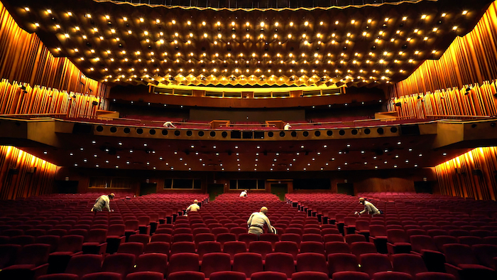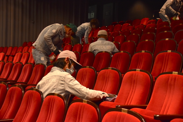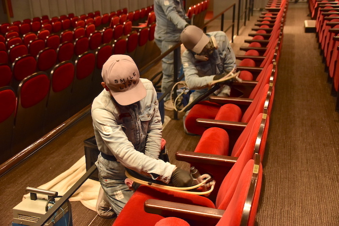 実際にシアタークリエの客席内の除菌作業を見学させてもらった。ウイルス侍を座席にスプレー噴射していく。縦に横にとまんべんなく、1座席あたりおよそ3分(シアタークリエ600席、帝国劇場1800席と考えると、ものすごい労力をかけている)。また、手すりの部分については、ウイルス侍を染み込ませた布で手塗りしていた。てっきり座席が湿っぽくなったり、化学的な匂いが気になったりするのかと思いきや、その心配は無用。目には見えないのだけれど、少しでも感染リスクを減らして、安心安全な観劇ができるのはありがたいと思った。