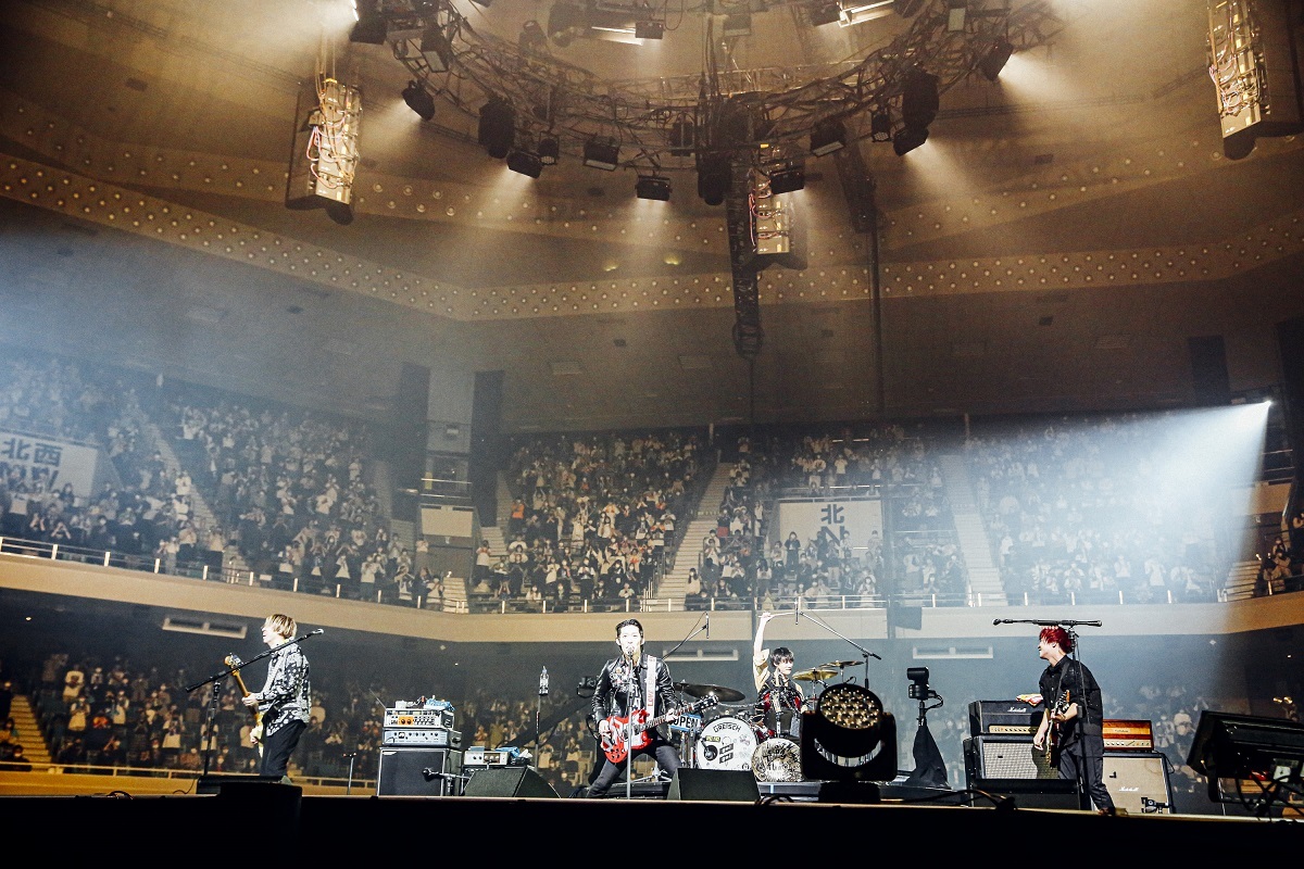 「俺たちが始まった1曲を!」(牧)と本編を締め括ったのは、バンドの原点にあたる「人間讃歌」で、アンコール1曲目「アクロス ザ ユニバーシティ」も同様に初期から存在する曲。柳沢のギターが出なくなるトラブルには、武道館に棲む魔物の存在を思い出させられたが、トラブルも何のその。ギターが復活するまでの間は他3人が繋ぎ、平然と曲が始まる流れにはバンドの逞しさを感じた。互いに元気で、また会えるように、という願いを込めてラストに演奏されたのは「ギフト」。ギターを弾きながらの唄い出し、最初の発音が力が入っていたのは、余すことなく全てを届けようという意思の表れか。場内は完全に明転。紙吹雪が舞うなか、牧は「日本武道館、愛してるぞー!」と叫んだのだった。