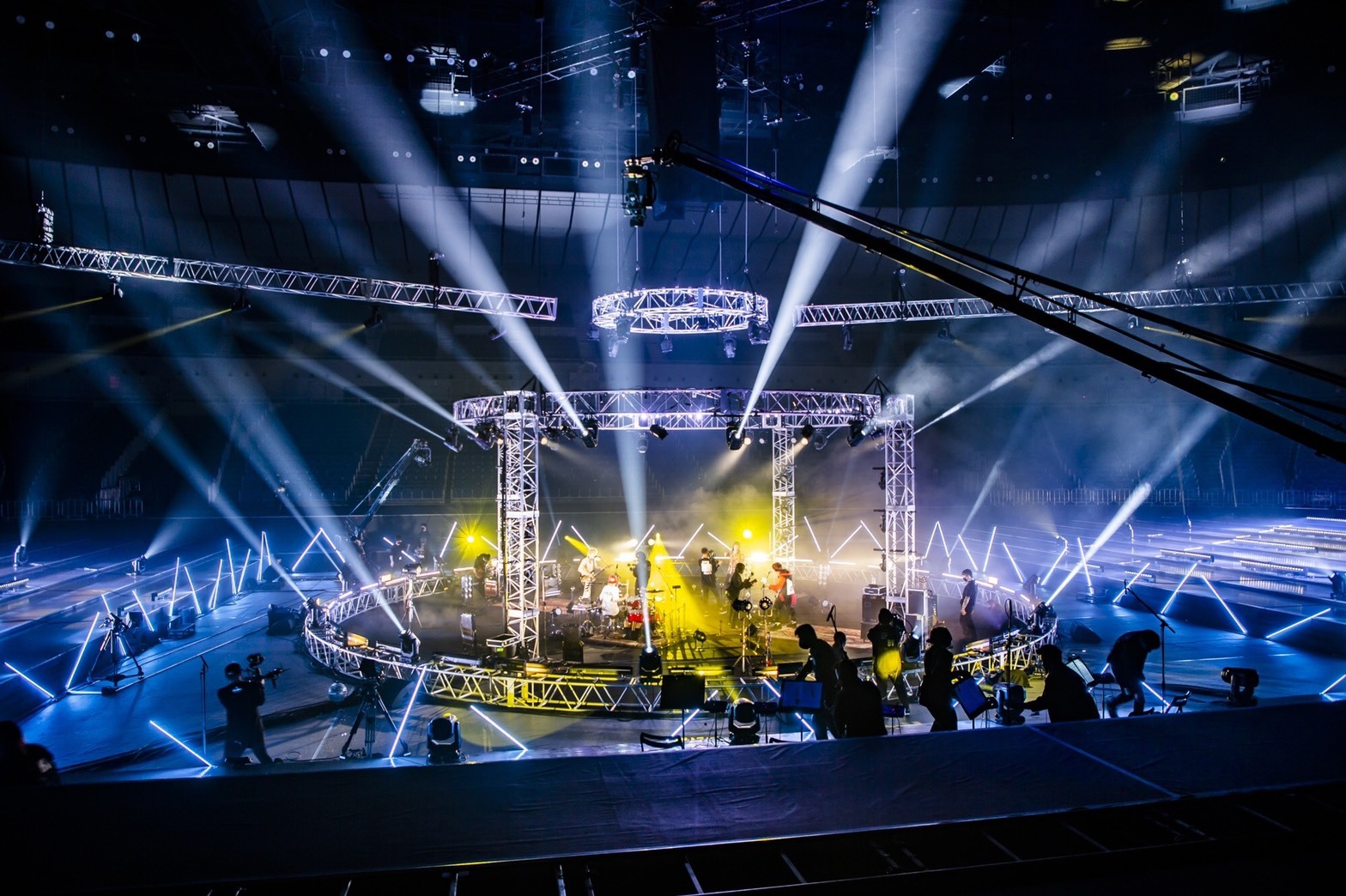 そして、渋谷から「うちのかわいこちゃん」と紹介された藤原は(笑)、「こういうときこそ歌えるバンドでありたいなと思ってやってきたので、よろしくお願いします!」と続け、再び渋谷が「そういうわけで、本日は無観客の横浜アリーナでございます!」と広大な会場を見渡すと、本来ならば1万7000人×2日間が満パンになるはずだった横浜アリーナの全景が映し出される。
