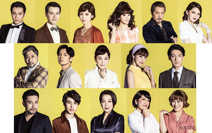 1段目左より)平方元基、 ウエンツ瑛士、 笹本玲奈、 昆夏美、 今井清隆、 朝夏まなと/2段目左より岸祐二、 上口耕平、 渚あき、 中別府葵、 宮原浩暢/3段目左より)中井智彦、 井阪郁巳、 家塚敦子、 三木麻衣子、 森加織 (C)ホリプロ