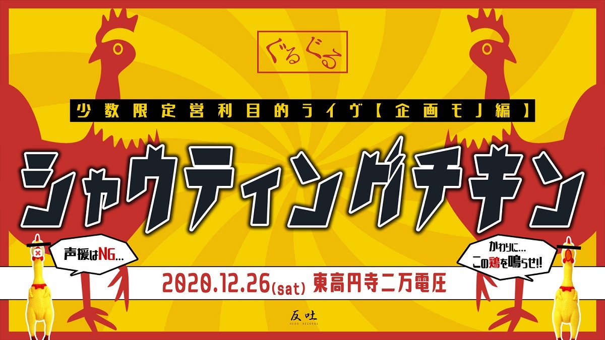 『少数限定営利目的ライヴ【企画モノ編】「シャウティングチキン」』は、2020年12月26日(土)に東高円寺二万電圧で開催。当日は、メンバーの螢ちゃん(Drums)の誕生日でもあり、1日遅いクリスマスを兼ねた盛大な“祭り”が繰り広げられそうだ。チケットは、12月15日(火)10:00~イープラスで発売開始となる。