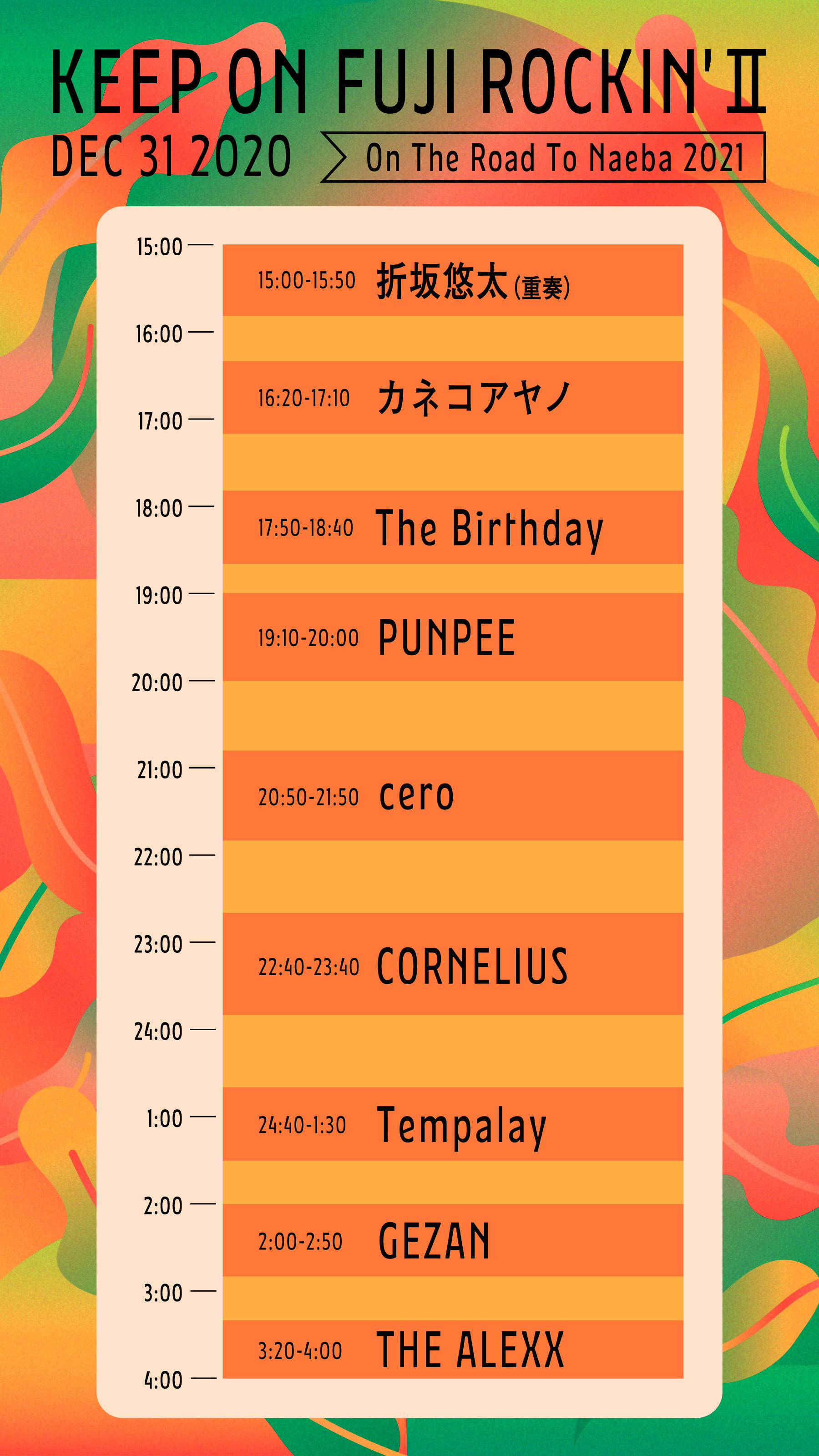 そして、12月31日 (木) に東京ガーデンシアターにて開催される『フジロック』のオールナイトイベント『KEEP ON FUJI ROCKIN’ II〜On The Road To Naeba 2021〜』のチケット全種類が本日12月12日10時に販売開始された。出演は、The Birthday、cero、CORNELIUS、GEZAN、カネコアヤノ、折坂悠太(重奏)、PUNPEE、Tempalay、THE ALEXXの9組。当日の模様はオンラインでも生配信され、アーカイブ配信は1月5日まで何度でも視聴可能となる。今公演のライブチケット及び生配信チケットは政府が行うGo To イベントを利用すると20%相当額が割引され、ライブチケットは8000円(定価10000円)、生配信チケットは3200円(定価4000円)で購入できる。