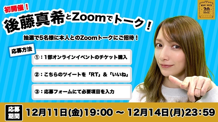 このZoomトークへは、20日(日)のオンラインライブ(1部ライブイベント)のチケットを購入後、後藤真希公式Twitterで告知された投稿をリツート&いいねをすることが応募条件。その後、応募フォームより応募をし、応募条件を満たした人の中から抽選で5名がゴマキとのZoomトークに参加することができる。