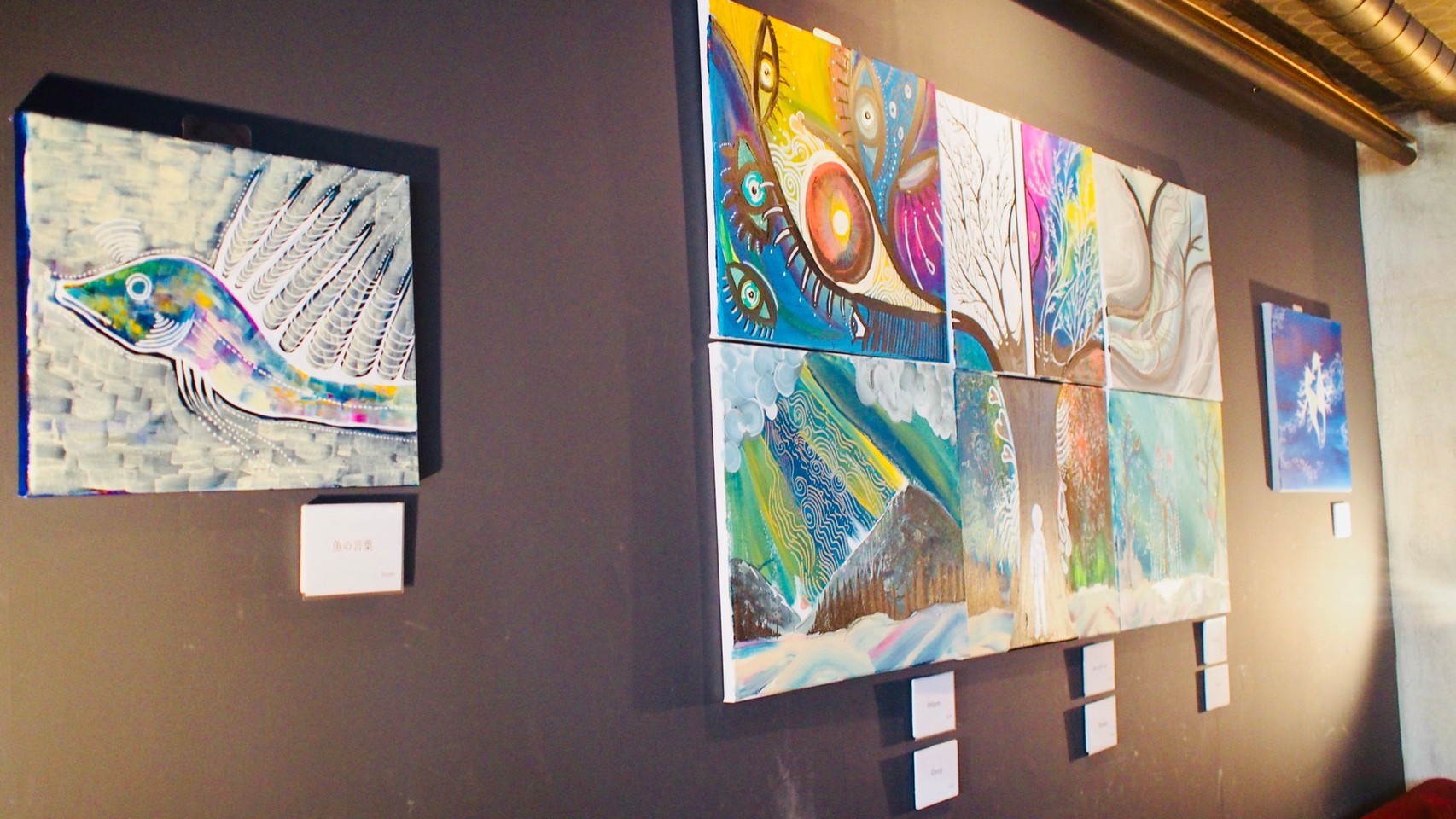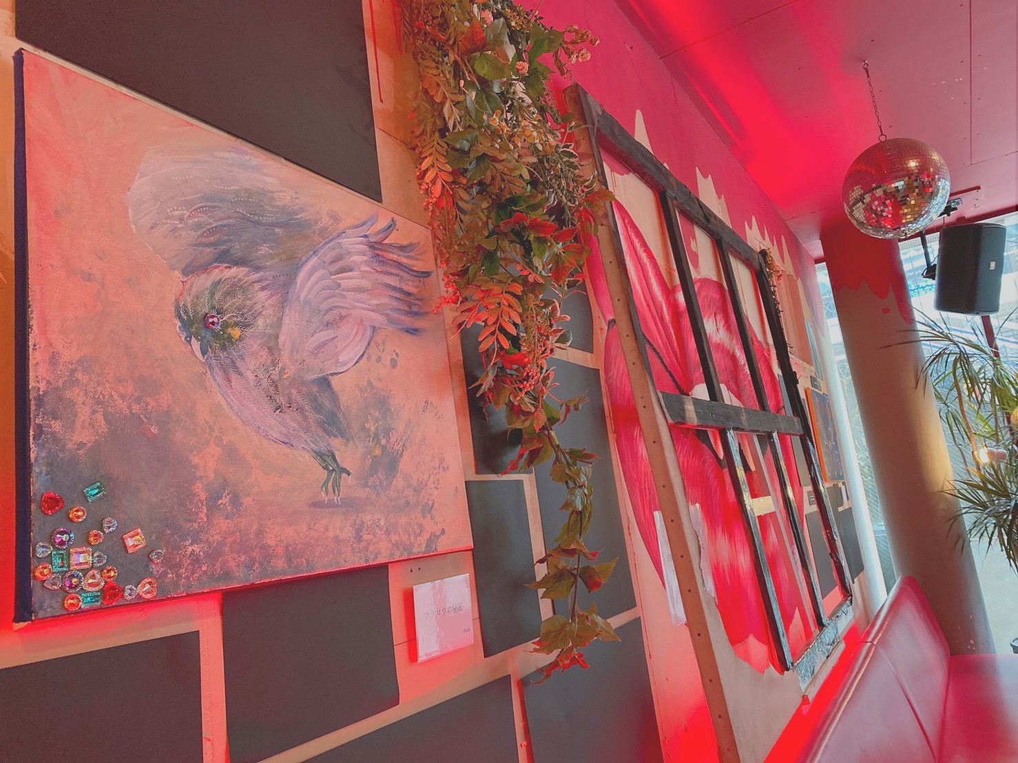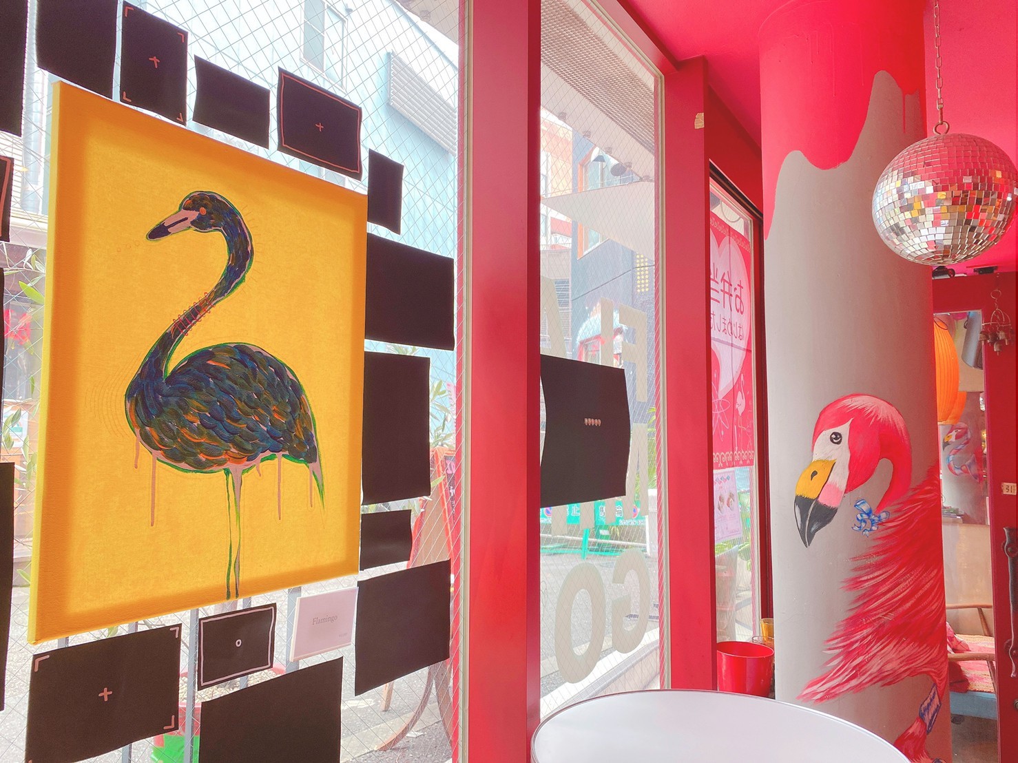 「FLAMINGO」には、その名も『Flamingo』と名付けられたフラミンゴの大きな絵が鎮座し、その他にも『kujyaku』『シカノメ』『フクロウの秘密』など力強さと神秘性を感じさせてくれる絵が、派手な店内で生命力を放っていた。