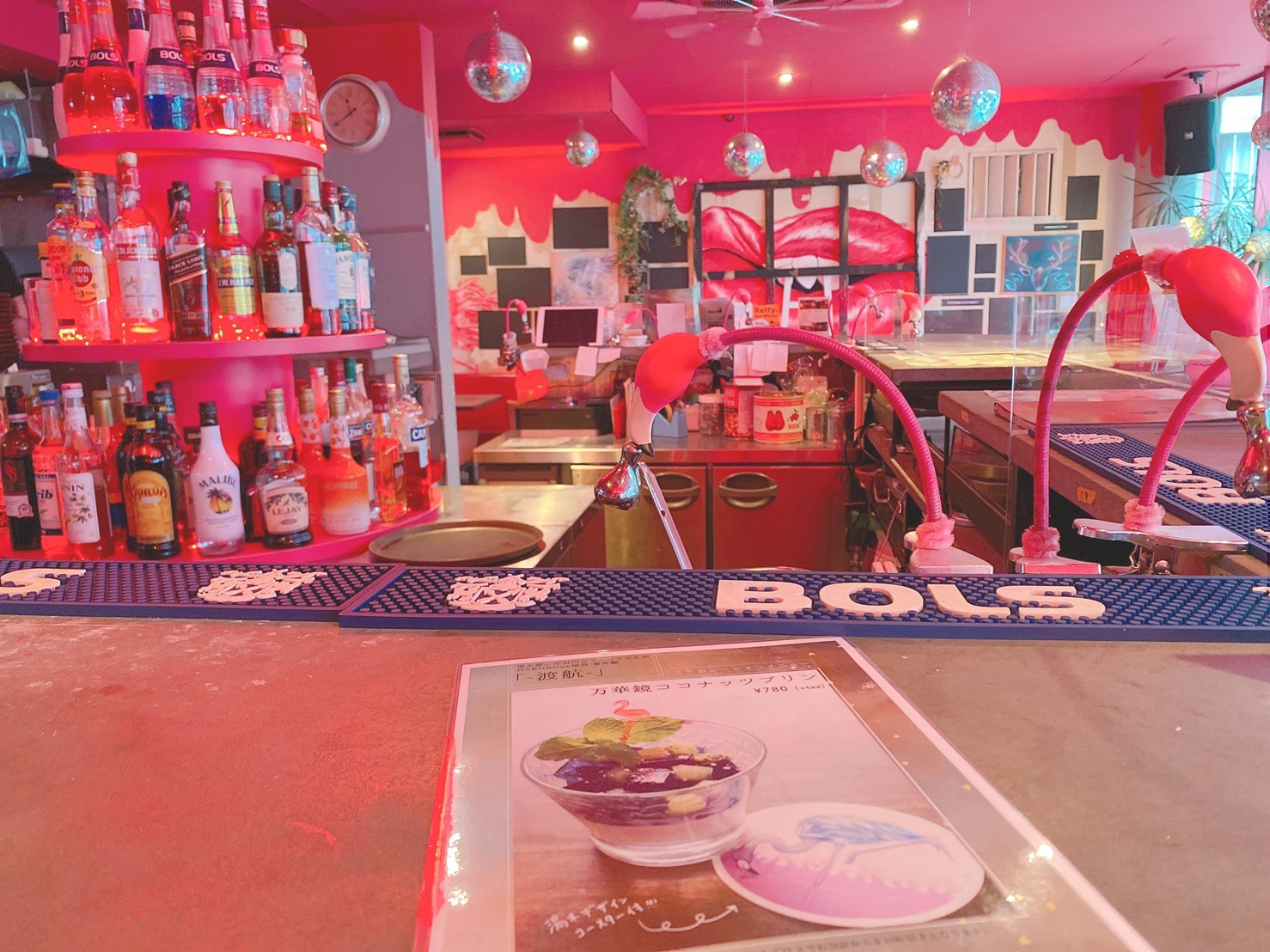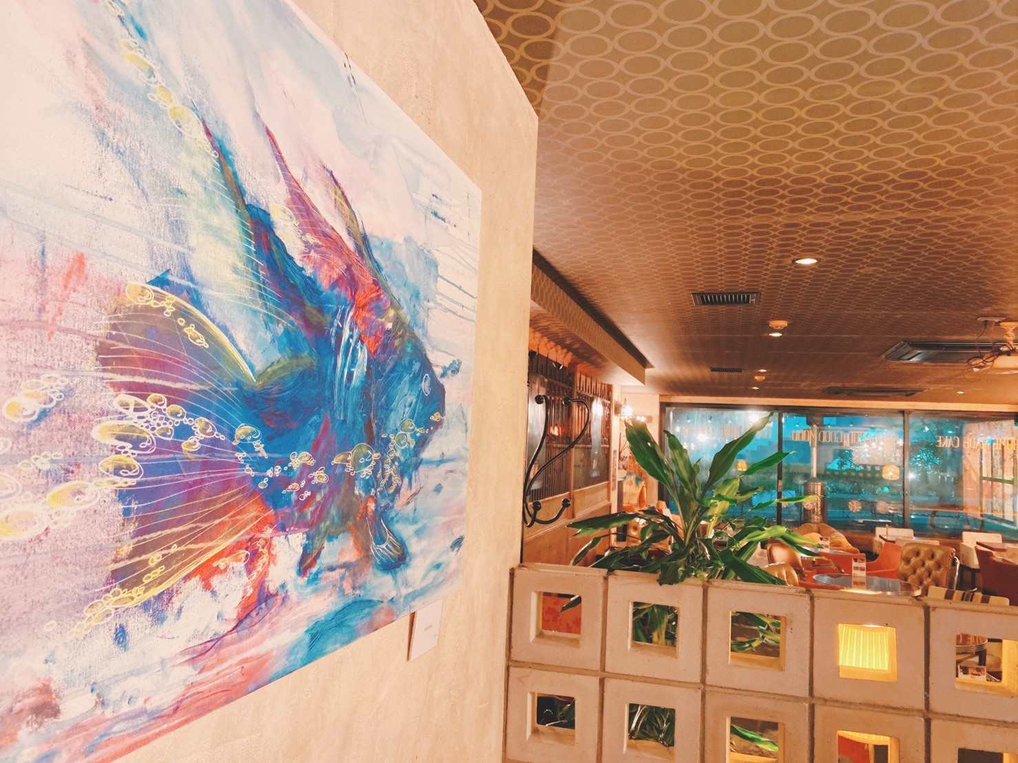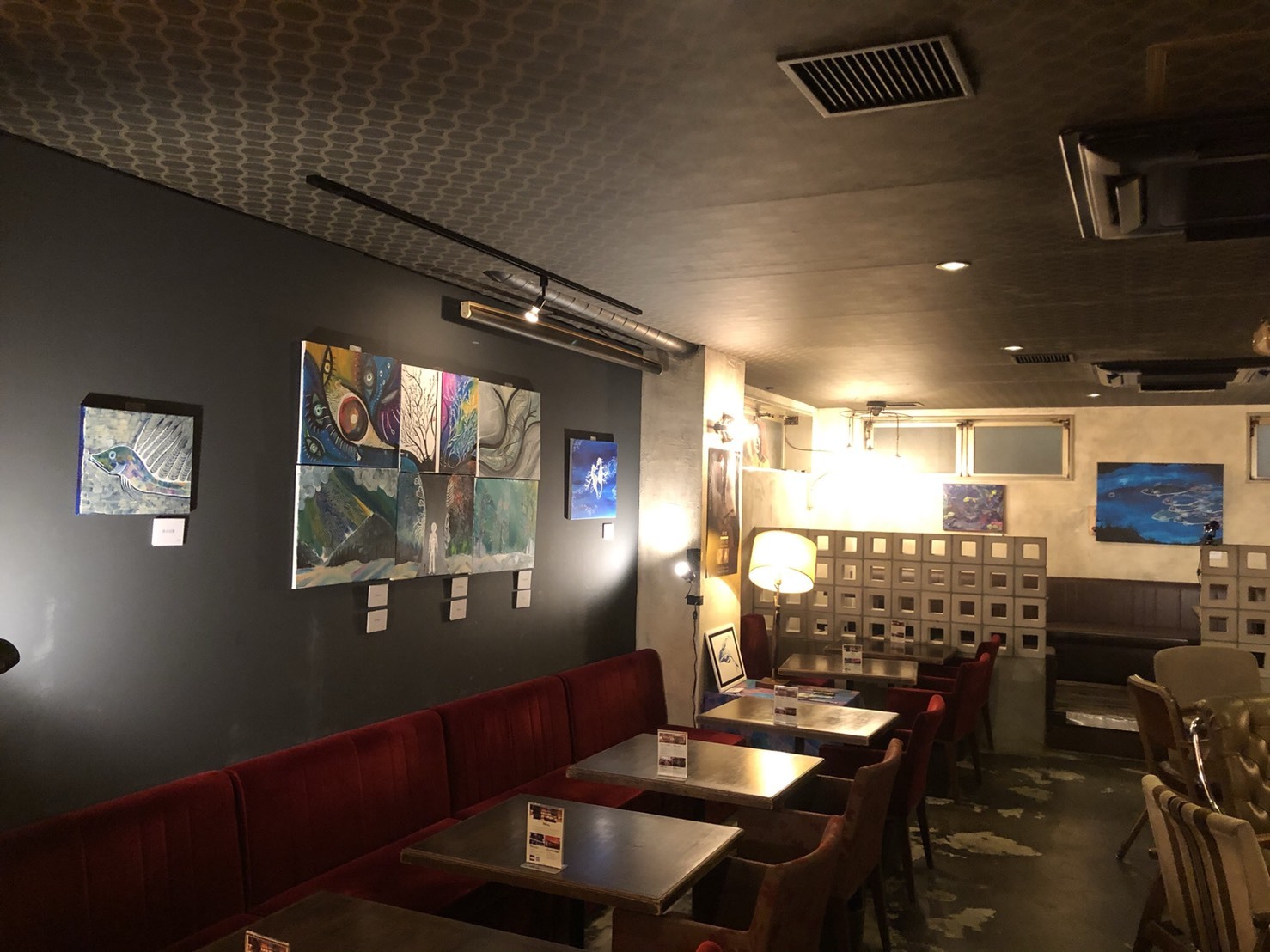 「FLAMINGO」には、その名も『Flamingo』と名付けられたフラミンゴの大きな絵が鎮座し、その他にも『kujyaku』『シカノメ』『フクロウの秘密』など力強さと神秘性を感じさせてくれる絵が、派手な店内で生命力を放っていた。