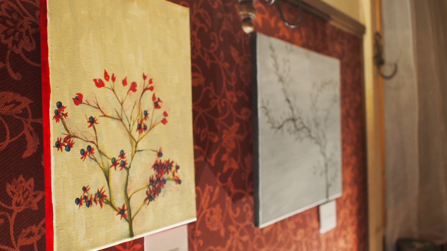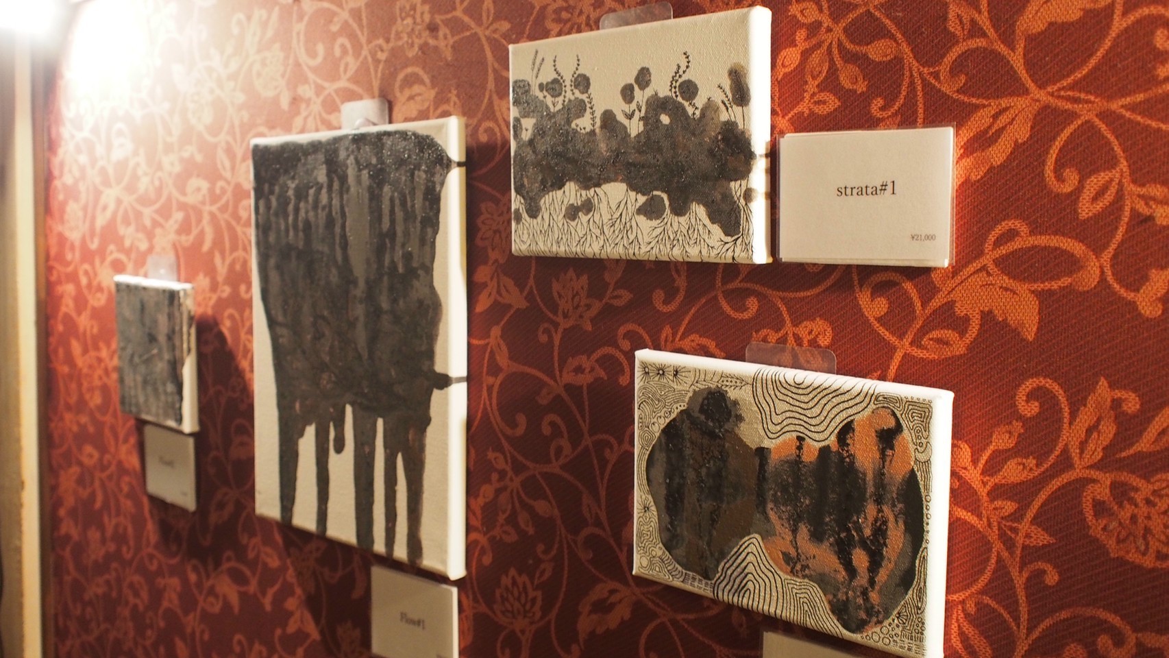 どの店舗でも入ってすぐ目が行くところに、お気に入りの作品を置いていたという。例えば「宇田川~」では『winter tree』と名付けられた枯れ木を描いた、でもどこか温かみを感じる絵が目に留まった。「冬だけど温かい色を使いたくて、下地に赤を入れていて、紅葉みたいな赤なので冷たい感じがするかもしれないけど、そうやって色で遊んだものが今回は多かったです。前までは意図して下地を塗ってから絵を描いたりはしていなかったのですが、今回はそんぼやり方で描いてみました」。
