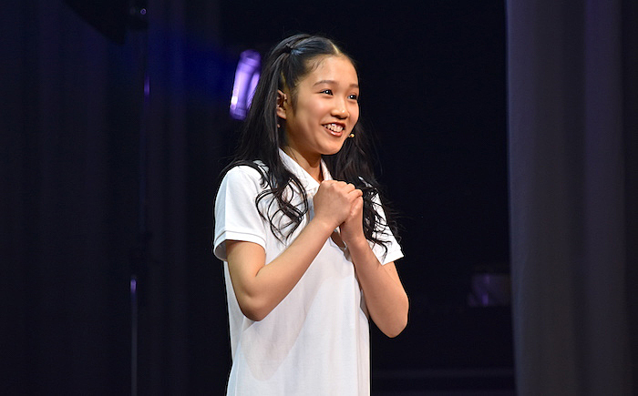 山﨑玲奈、13歳、中学2年生です。好きな食べ物は、いちごと白ごはんです。嫌いな食べ物は……たくさんあります。自分は歌やダンスや演技がとても好きなので、いつも心から楽しんで歌ったり踊ったりしています。