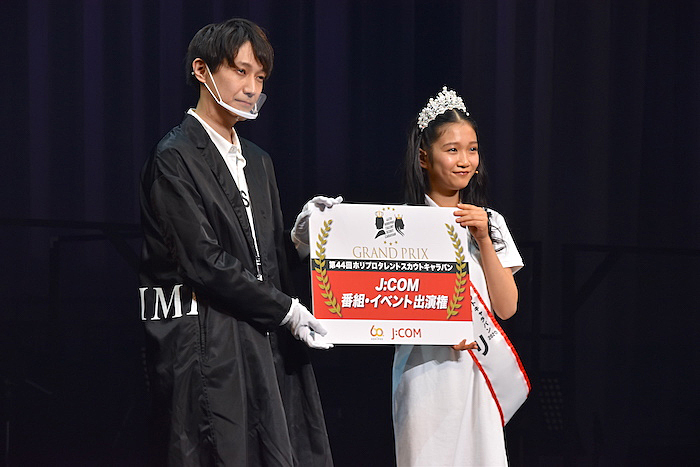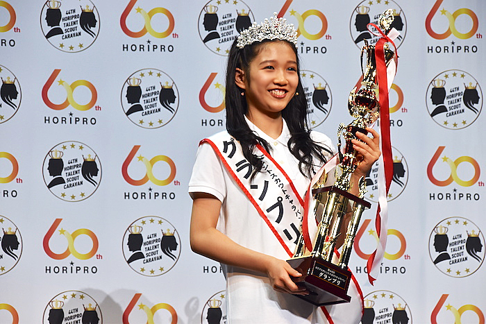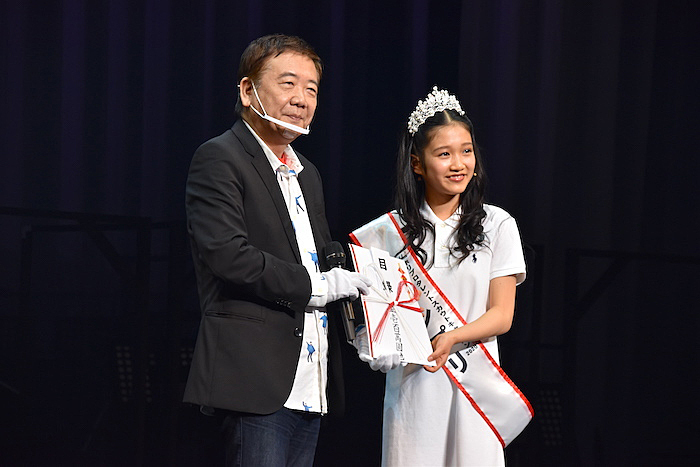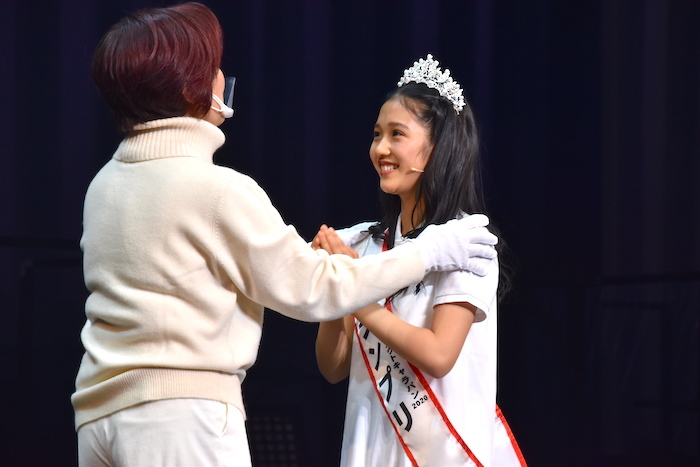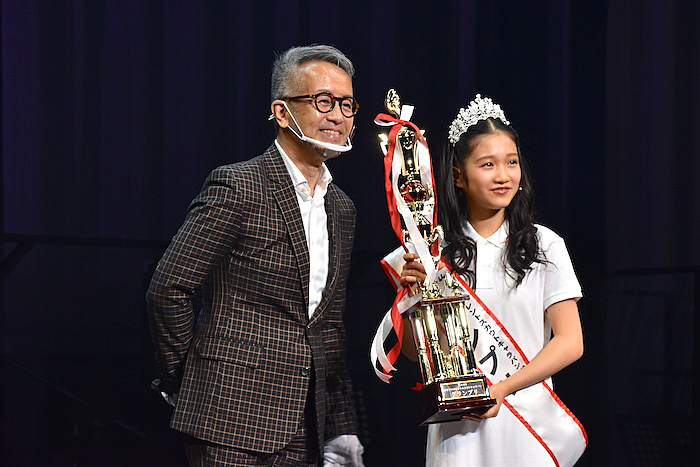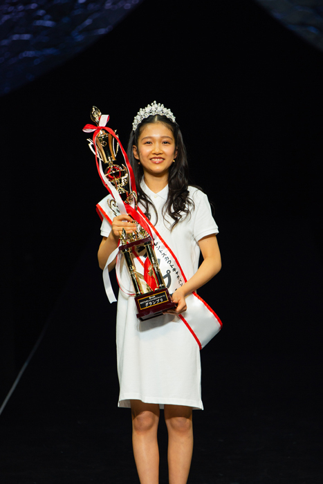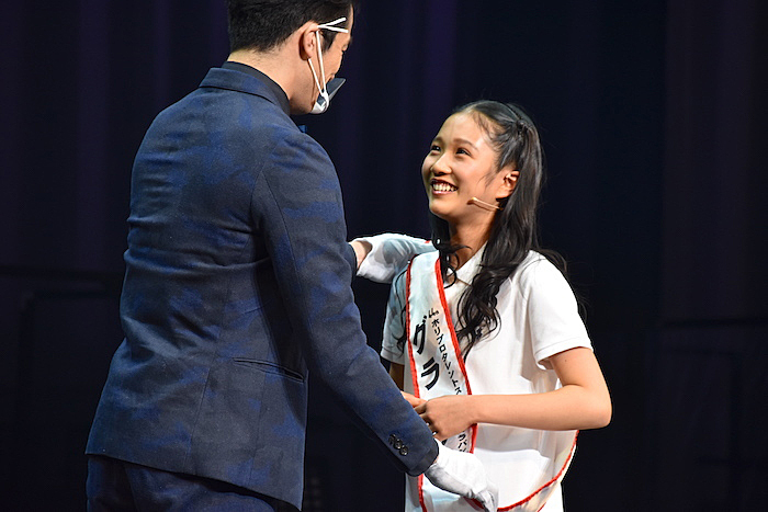 そして、見事グランプリの栄冠に輝いたのは、愛媛県出身の山﨑玲奈さん。2007年1月28日生まれの中学2年生。趣味・特技はピアノとモノマネ。丸美屋食品ミュージカル『アニー』2019でタイトルロールのアニー役を射止めた経験もある実力派。受賞を告げられた瞬間は笑顔で、時々少し涙ぐむ様子も。襷(たすき)やティアラ、番組&イベント出演権、目録、トロフィー、花束と、次々に手渡される中で、笑顔が弾けた。