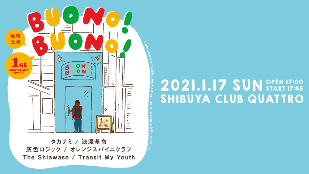今年4月4日に新宿Marbleで開催予定だった新宿Marble主催イベント『BUONO!BUONO!』の1周年記念公演が、1月17日(日)に会場の規模を拡大し渋谷CLUB QUATTROで開催することが決定した。