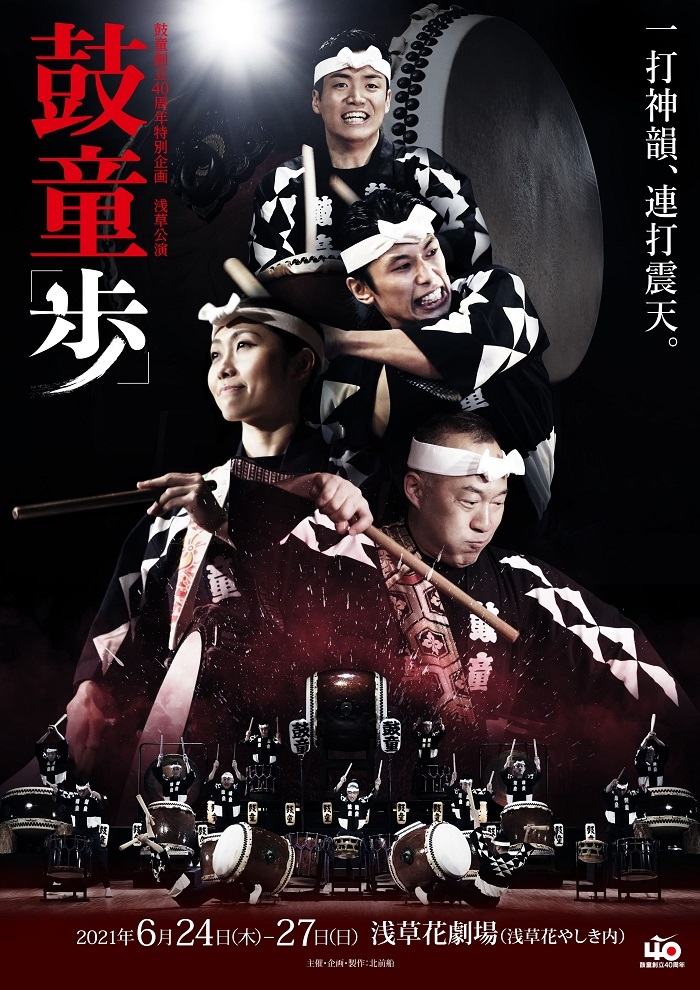 2021年6⽉24⽇(⽊)〜27⽇(⽇)「浅草花やしき」内「浅草花劇場」にて、⿎童創⽴40周年特別企画 ⿎童浅草公演『歩』が上演されることが決定した。
