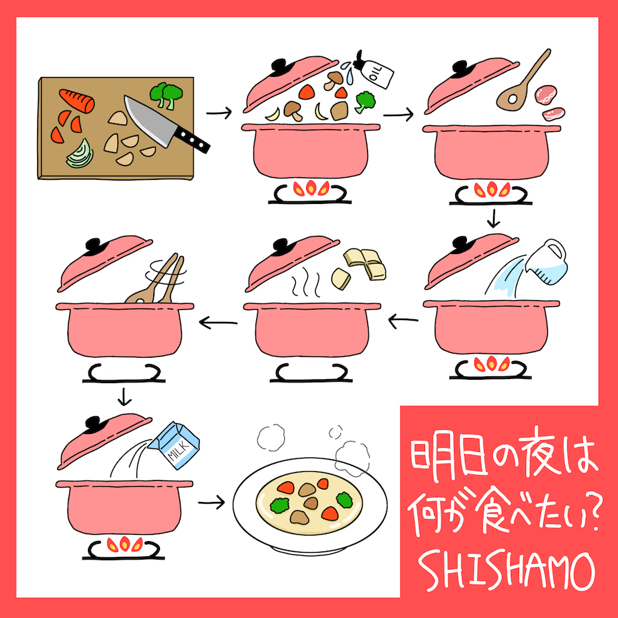 新曲「明日の夜は何が食べたい?」は、相手を大切に想うからこその不安や伝えられない寂しさを料理を作る事にフォーカスして表現したラブソングに。合わせてジャケットも公開され、楽曲の歌詞にも出てくる“シチュー”を作る工程が丁寧に描かれた、宮崎朝子(Gt/Vo)描き下ろしのイラストとなっている。