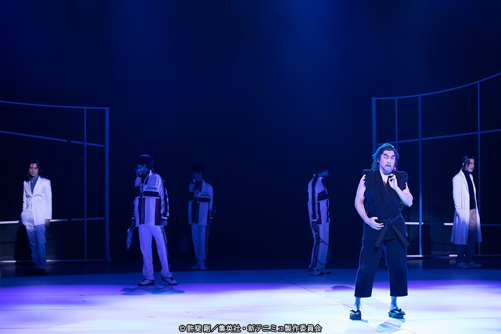 越前リョーマ(今牧輝琉)、手塚国光(山田健登)、桃城 武(寶珠山 駿)、橘 桔平(GAKU)、跡部景吾(高橋怜也)、切原赤也(前田隆太朗)、白石蔵ノ介(武本悠佑)、千歳千里(松島博毅)、遠山金太郎(平松來馬)、リリアデント蔵兎座 (新谷デイビッド)ら、伸び盛りのフレッシュな中学生チームの先陣をきってソロナンバーを披露したリョーマ役の今牧。無垢な元気オーラがパーッと場内を明るさで包み、テニミュ熱がぐんっと上がっていく……が、そこに現れたのは黒部由起夫(村上幸平)、齋藤 至(和泉宗兵)、三船入道(岸 祐二)のコーチ陣。エレガントな黒部、知的な齋藤、ワイルドな三船と三者三様の個性で「ここでの全てを牛耳るのは自分たちだ」という存在感を見せつけてくれる。そして、彼らによる想像を超えた合宿システムの中、中学生と高校生の間に飛び交うピリピリとした緊張感と、互いに「勝ち」への信念を持って向き合う空気──それぞれのプライドが渦巻く合宿所で新たな戦いが始まっていく。
