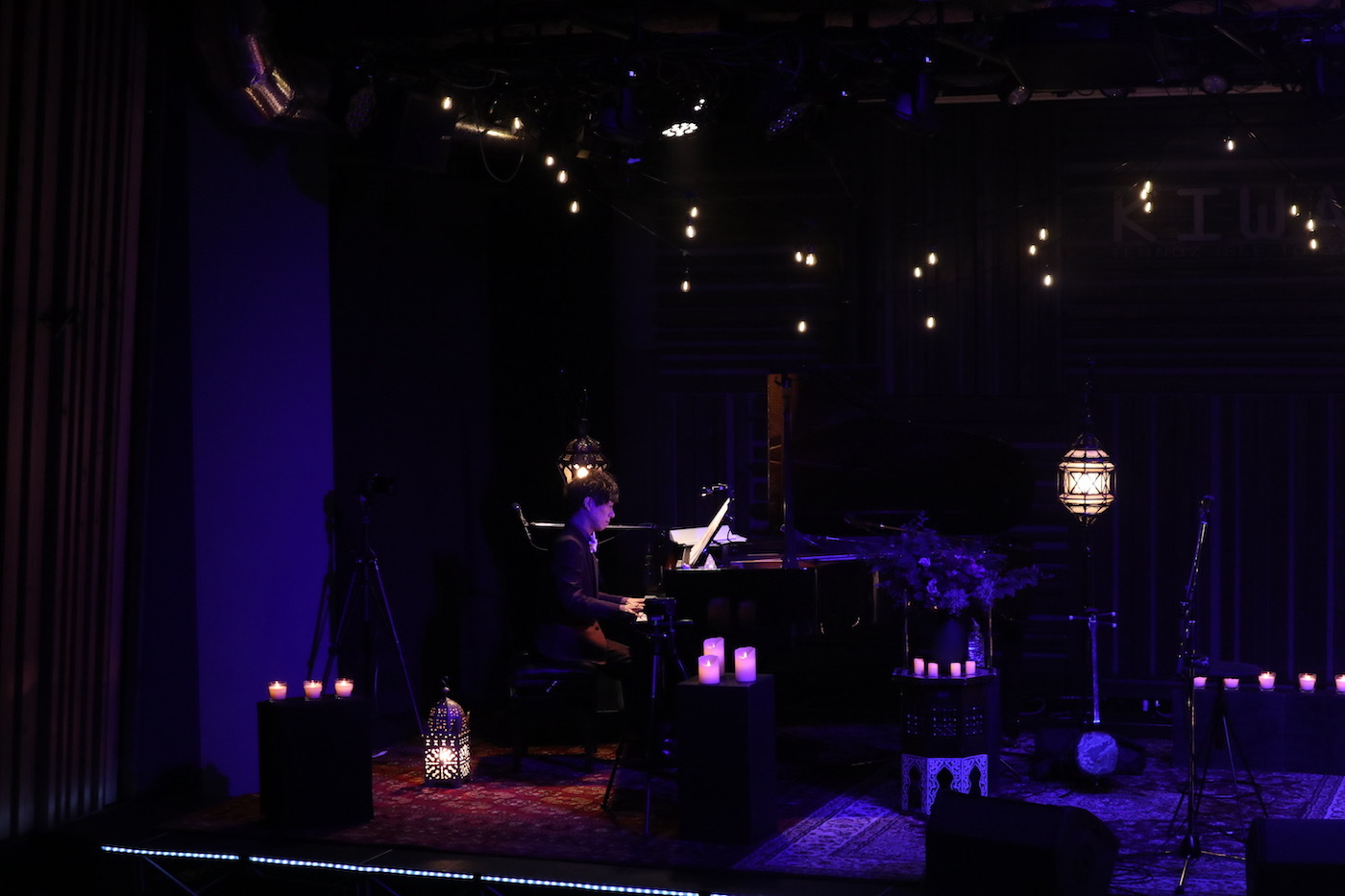 ピアノの上に飾られた、滋賀県・Rose Farm Keiji育ちで花道家の大久保有加が生けた見事なWABARAを紹介したのち、松本がピアノソロで届けてくれたのは、自身のアルバム『Pianoia II』に収録の「星を読む人」とカッチーニ作の「アヴェ・マリア」。星の満ちる冬の空を想起させたり、クリスマスムードの中に哀愁を感じさせたり、彼が指先で描く世界は本当に彩り豊かだ。