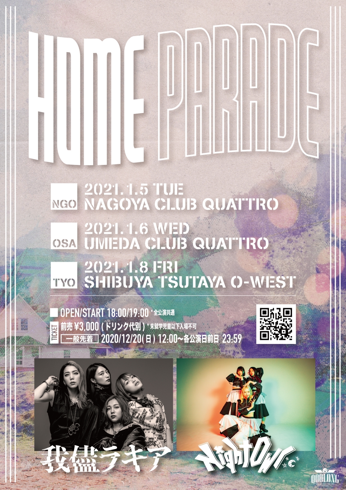 我儘ラキア・NightOwlを擁するQOOLONGが、これまで開催していた主催イベント『FEST』を『HOME PARADE』と名前を変えて東名阪ツアーの開催を発表した。