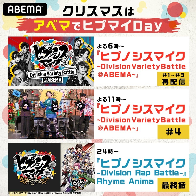 同日には、『ヒプノシスマイク ~Division Variety Battle@ABEMA~』#1~3の再配信、『ヒプノシスマイク-Division Rap Battle-』Rhyme Anima 第13話(最終話)も無料配信。12月25日(金)のクリスマスは、アベマでヒプマイDayを楽しもう。