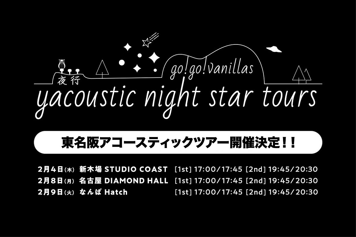 go!go!vanillasが、2021年2月に東名阪アコースティックツアー『yacoustic night star tours』を開催することを発表した。
