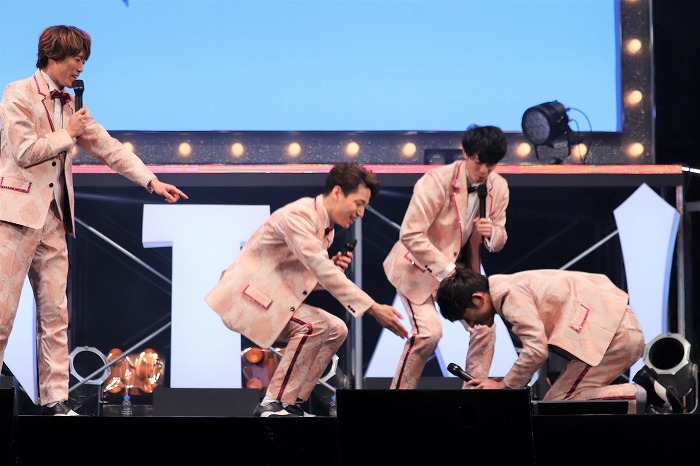 ゲネプロの前に行われた写真撮影では普通は撮られる側はあまり喋らないものだが、ふぉ~ゆ~は違う。「お忙しい中、お越しくださりありがとうございます。ふぉ~ゆ~です!」「ENTA3! でございます!」「僕らが噂のふぉ~ゆ~です」「ジャニーズ歴22年です! 哀愁を感じるでしょ!?」などと口にして取材陣を笑わせていた。