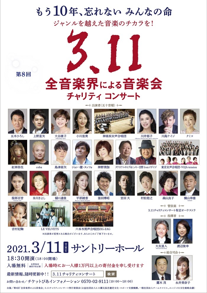 3.11 チャリティコンサート『全音楽界による音楽会』が、2021年3月11日(木)サントリーホールにて開催される。