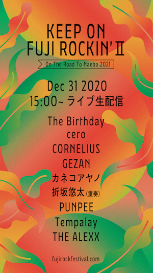 オンライン生配信ライブの出演は、The Birthday、cero、CORNELIUS、GEZAN、カネコアヤノ、折坂悠太(重奏)、PUNPEE、Tempalay、THE ALEXXの9組で、アーカイブ配信は1月5日まで何度でも視聴できる。また、今公演は政府が行うGo To イベントを利用すると生配信チケットは20%引きの3200円(定価4000円)で購入できる。販売期間は2021年1月5日(火)9時まで。