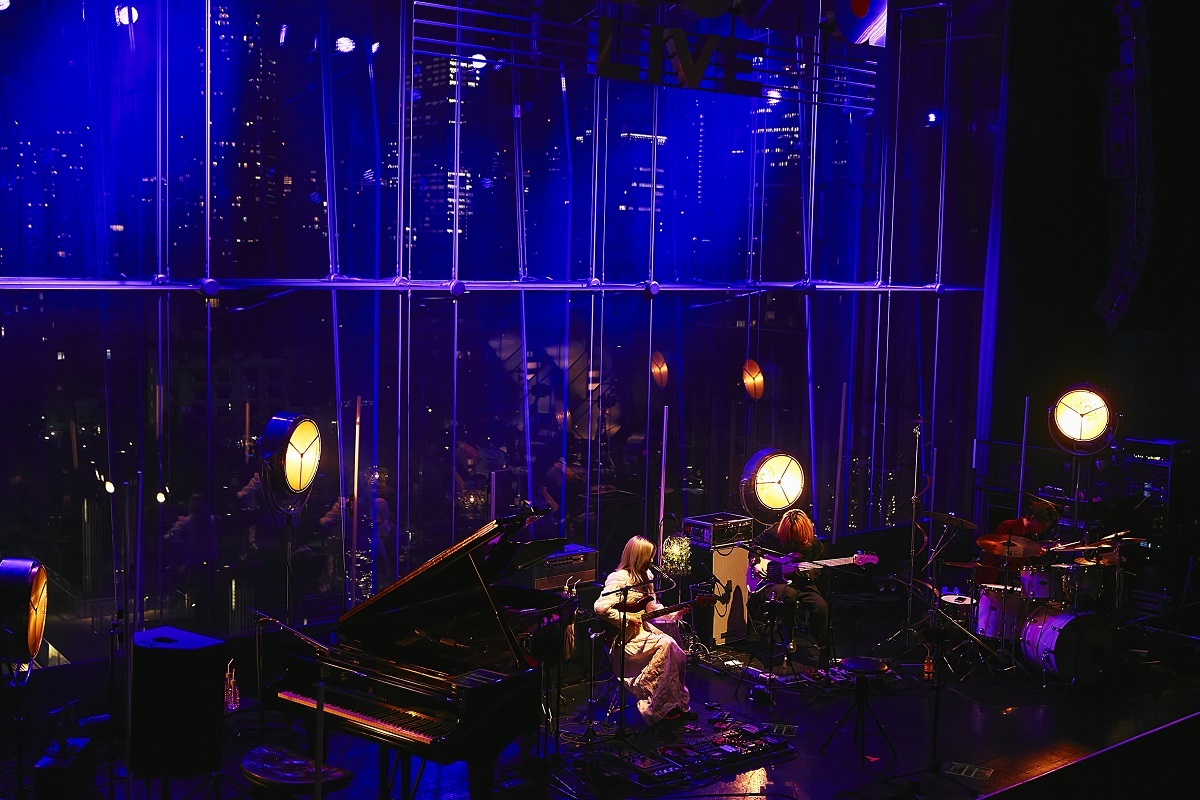 ピアノから離れ、ハイチェアに腰掛けた中村のアカペラから始まった「inertia」。チル・アウトするような余白と空気を含んだ音楽。たゆたうような時間で歌われる鎮魂歌はどこか狂気すら感じさせるが、Billboard Live TOKYOの上質なライブ空間が聖堂のように見えてしまうライティングとカメラワーク。残響する音たちに松本の唸るようなベースが混ざり合う。