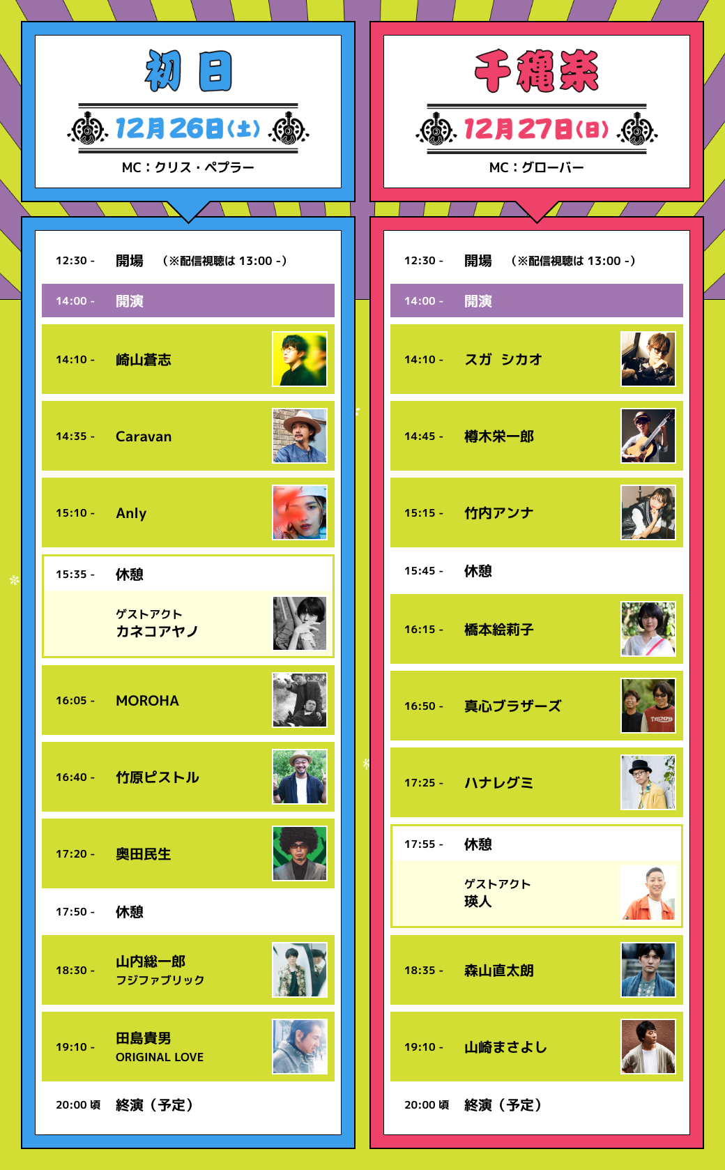 開催初日12月26日(土)に出演を予定していた氣志團の新型コロナウイルス感染に伴う出演キャンセルを受けて、その代替出演として同日に山内総一郎(フジファブリック)の出演が決定。山内総一郎(フジファブリック)の出演時間は氣志團がパフォーマンスを行う予定だった同日18:30からを予定しているとのこと。