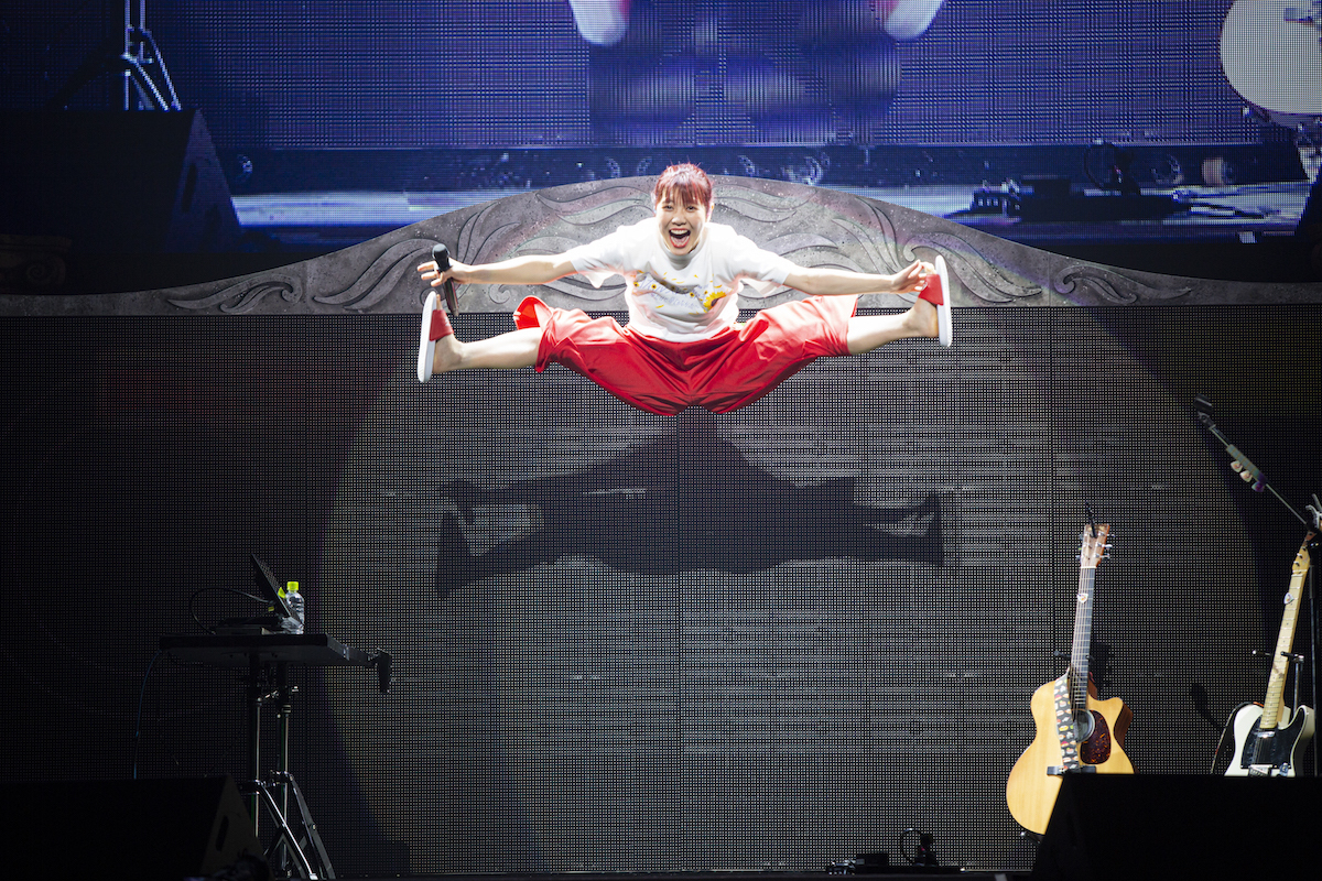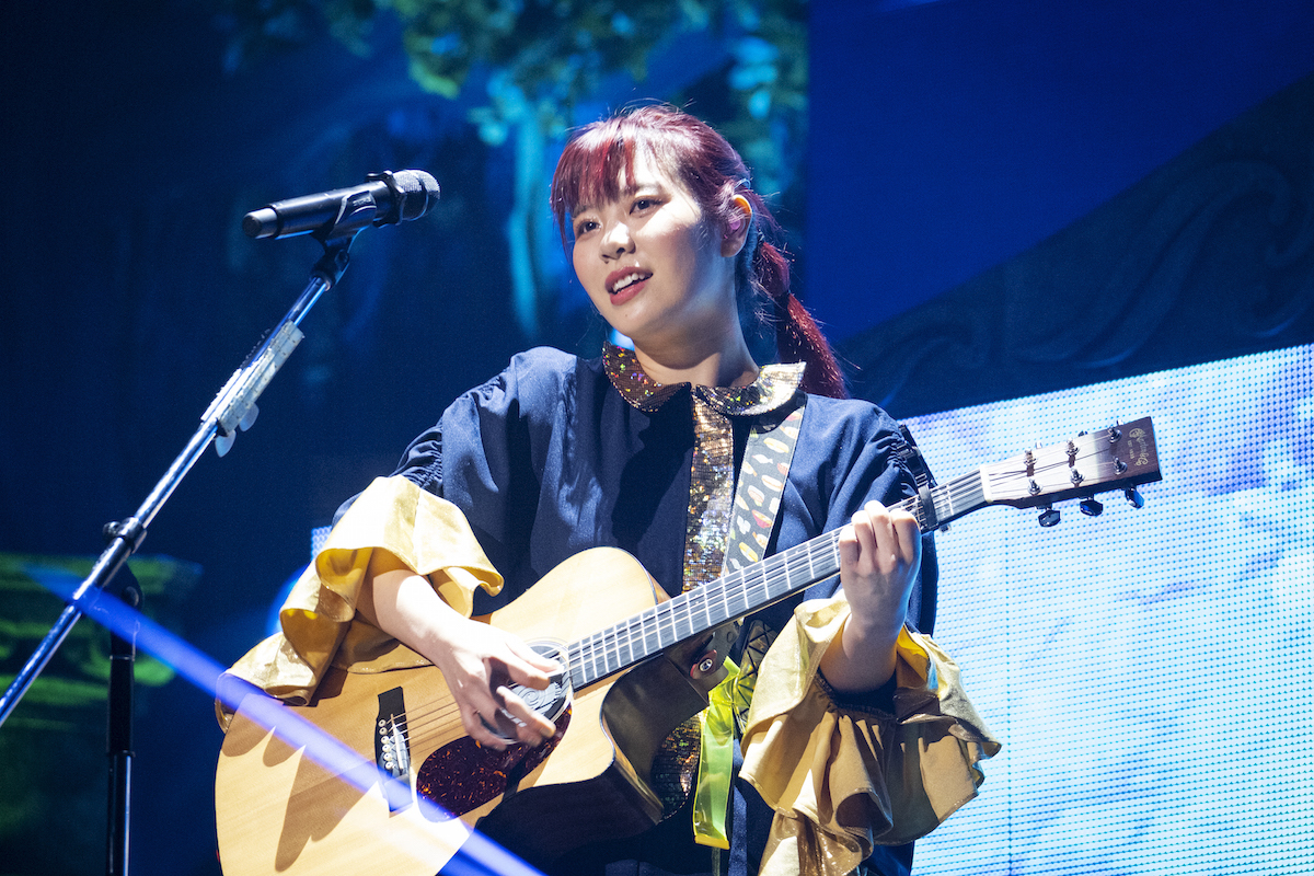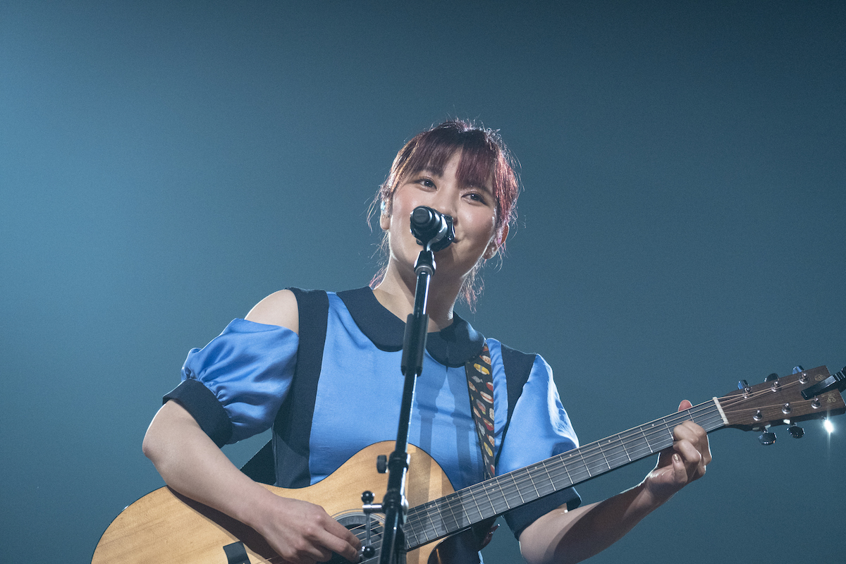 支えてくれる人達と一緒に歩んできた軌跡を描いた「夢だけど夢じゃなかった」を高らかに歌い上げ、5分間の“換気時間”を挟み、ライブは後半へ。青のワンピースに着替えた眉村は、センターステージでアコギの弾き語りを披露。「顔面ファラウェイ」「ツクツクボウシ」などをマッシュアップさせ、観客を惹きつける。