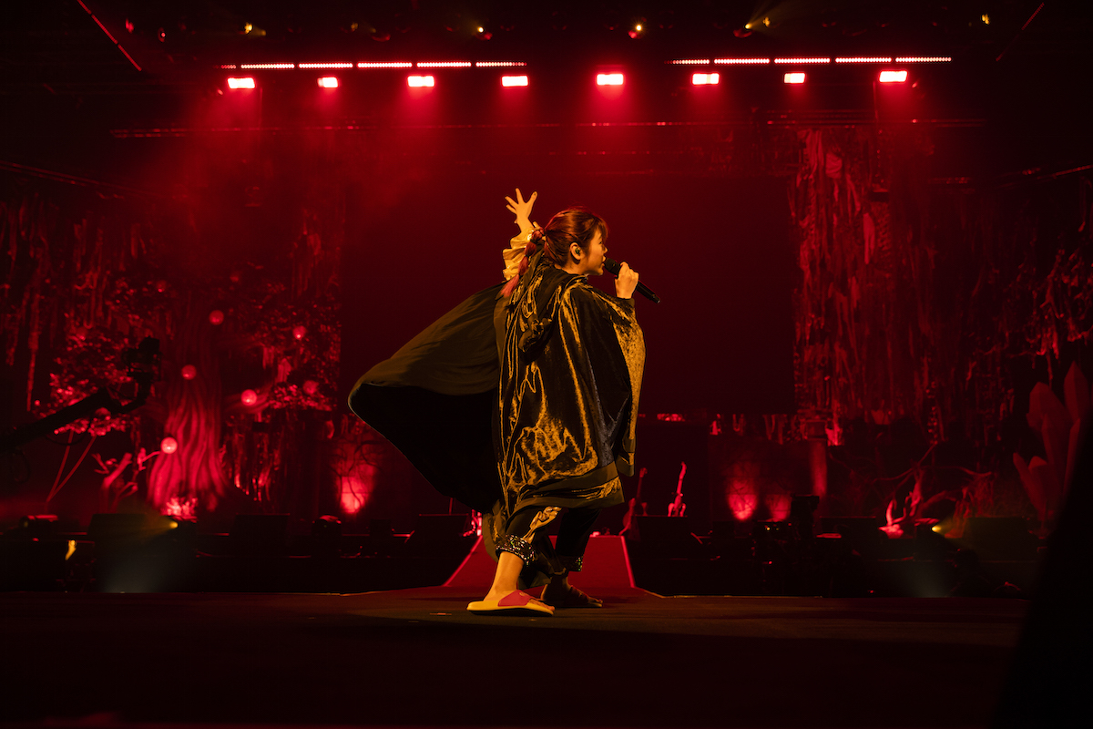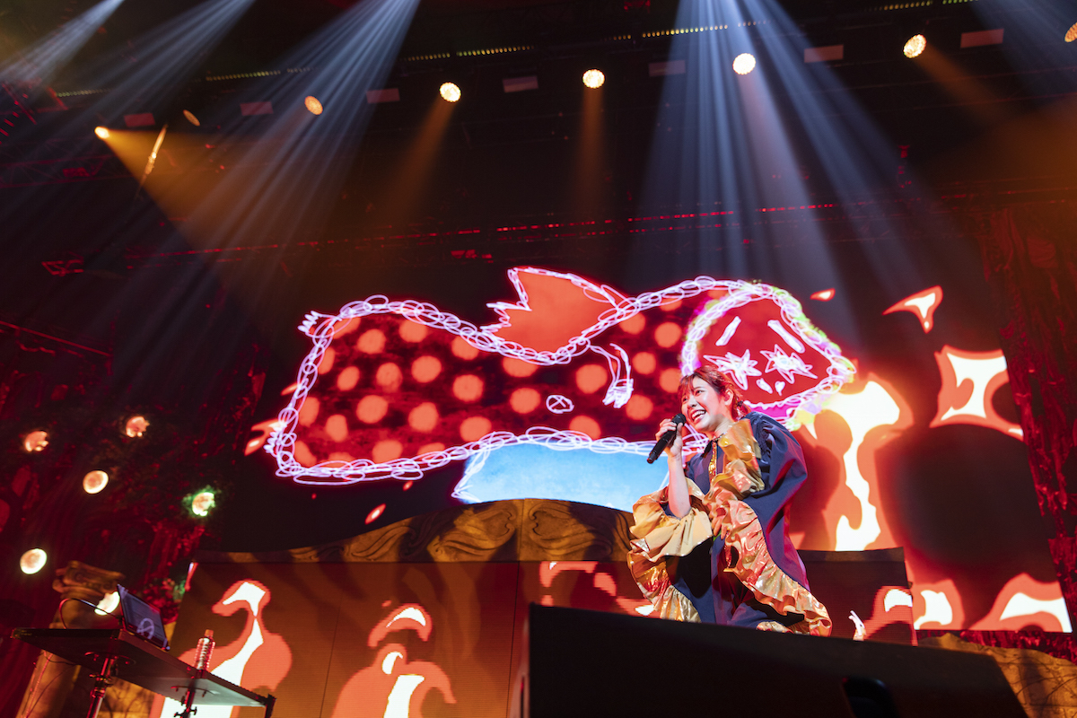 アンコールも意外性に溢れたステージを展開。高揚感のあるサウンドとともにステージ下からポップアップで登場したと思ったら、すぐさま「キャハハハ! 楽しい! もう1回やって!」と要求。再びステージ下から勢いよく飛び出し、「奇跡・神の子・天才犬!」をパフォーマンス。最後は「ピッコロ虫」。<車の中 こぼした愚痴>とアカペラで歌い出し、<こんな赤ちゃんはいつまでだろう>とラップに移行……と思ったら、左右の人差し指と小指を合わせて頭上に掲げ、「ねえ、こうやって。私たちはこうやってその場しのぎで生きていこう」と笑いを取る。さらにハイトーンの歌声を高らかに響かせ、「ピッコロ虫」を最後まで歌い切り、ライブはエンディングを迎えた。