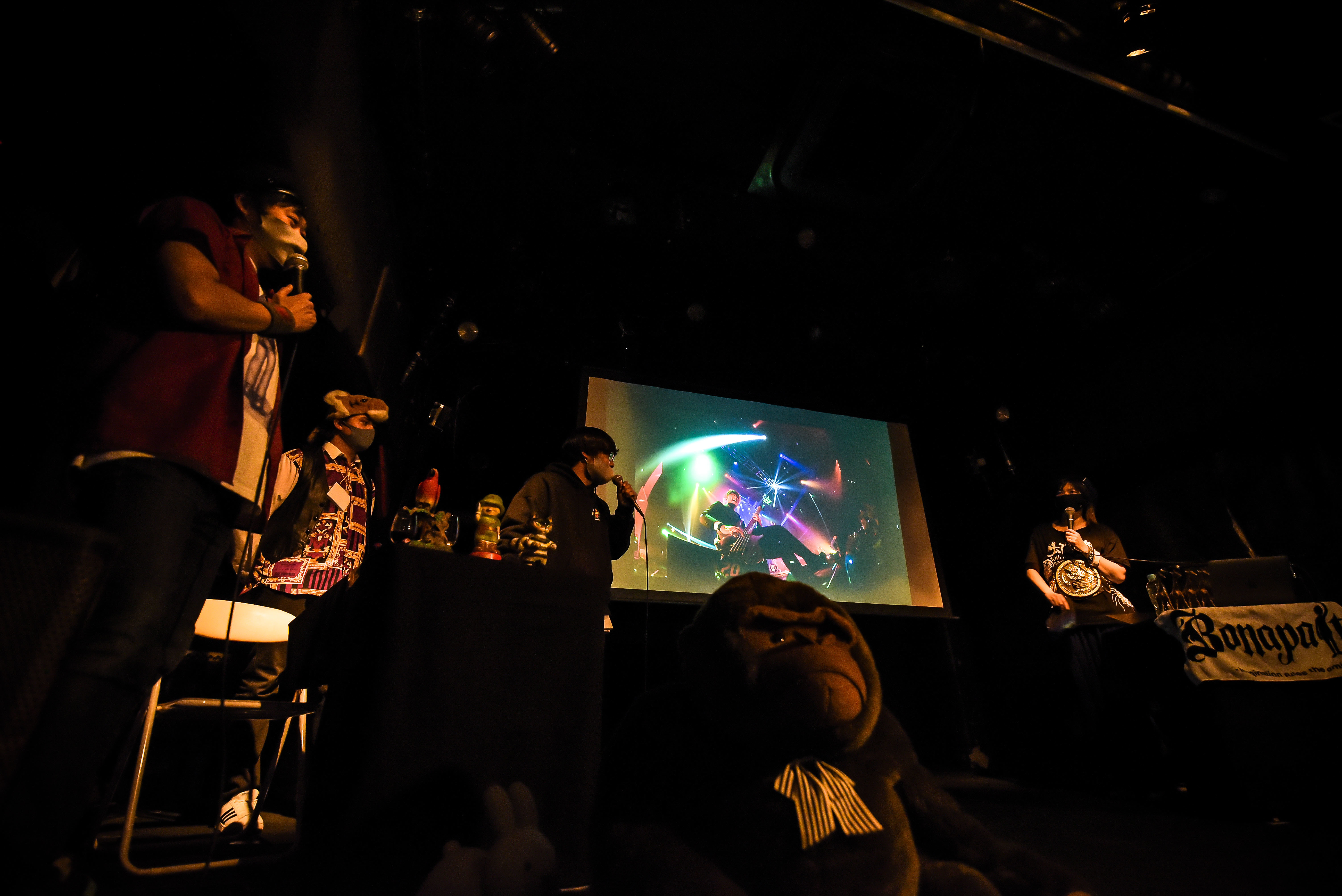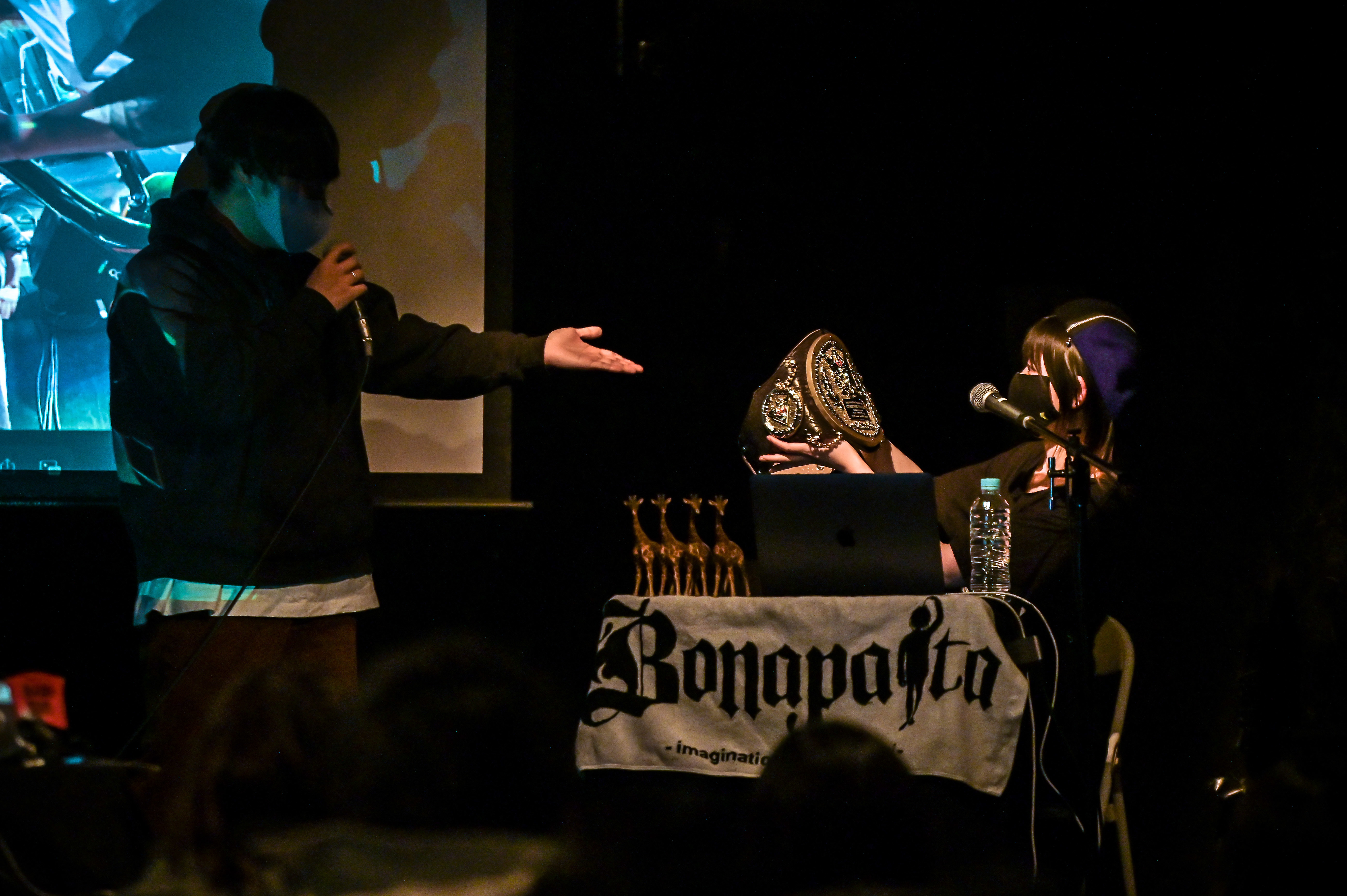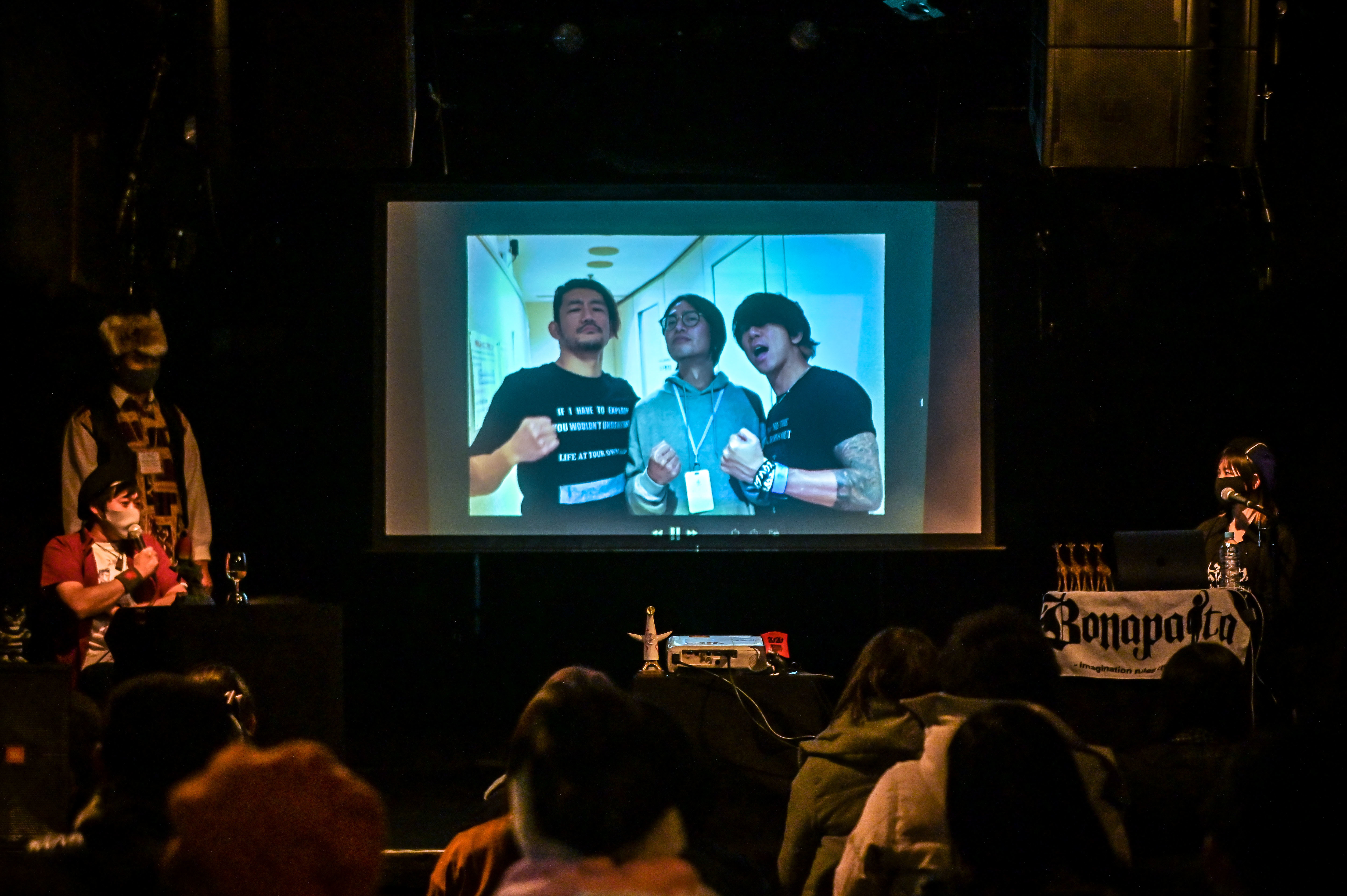 実はこれ、彼女が過去に闘病に打ち勝つようにと、横山健とともに松原氏にチャンピオンベルトを贈呈していたのだが、今回のツアー完走を祝うため新たなベルトを作ってお返しするサプライズだった。また、前日に京都で開催された同イベントにゲストで出演していたROTTENGRAFFTYからは、集まった観客にドリンクサービスのプレゼントも。ライブハウスに遊びに来てくれるお客さんに恩返しと、トークイベントのギャラを全額ドリンク代に代えてしまう、漢気あふれる心意気はさすがだ。その後も3人の和気あいあいとしたトークは続き、スクリーンにはいくつものライブ写真が映しだされ、ライブと同じように、2時間近いイベントはあっという間に終幕へ。