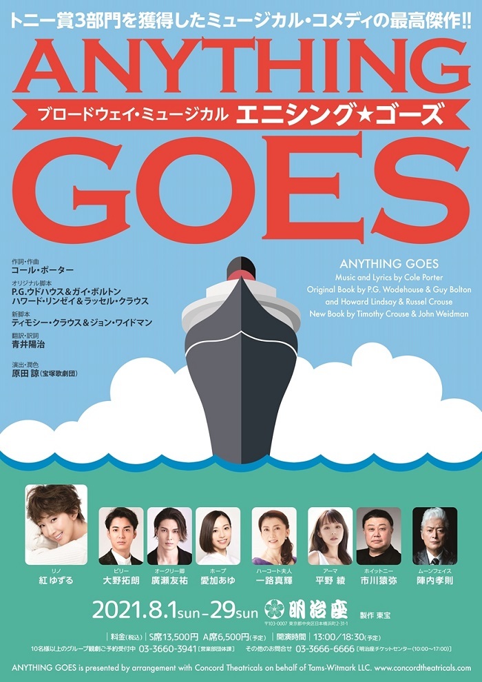 2021年8月に明治座にて上演される紅ゆずる主演のブロードウェイ・ミュージカル『 エニシング・ゴーズ』の共演者が発表となった。