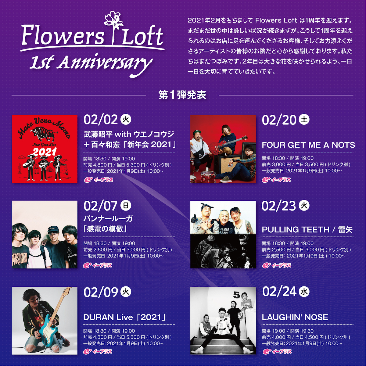 2021年2月にオープン1周年を迎える下北沢のライブハウス・Flowers Loftが、記念イベント第1弾として6公演を発表した。
