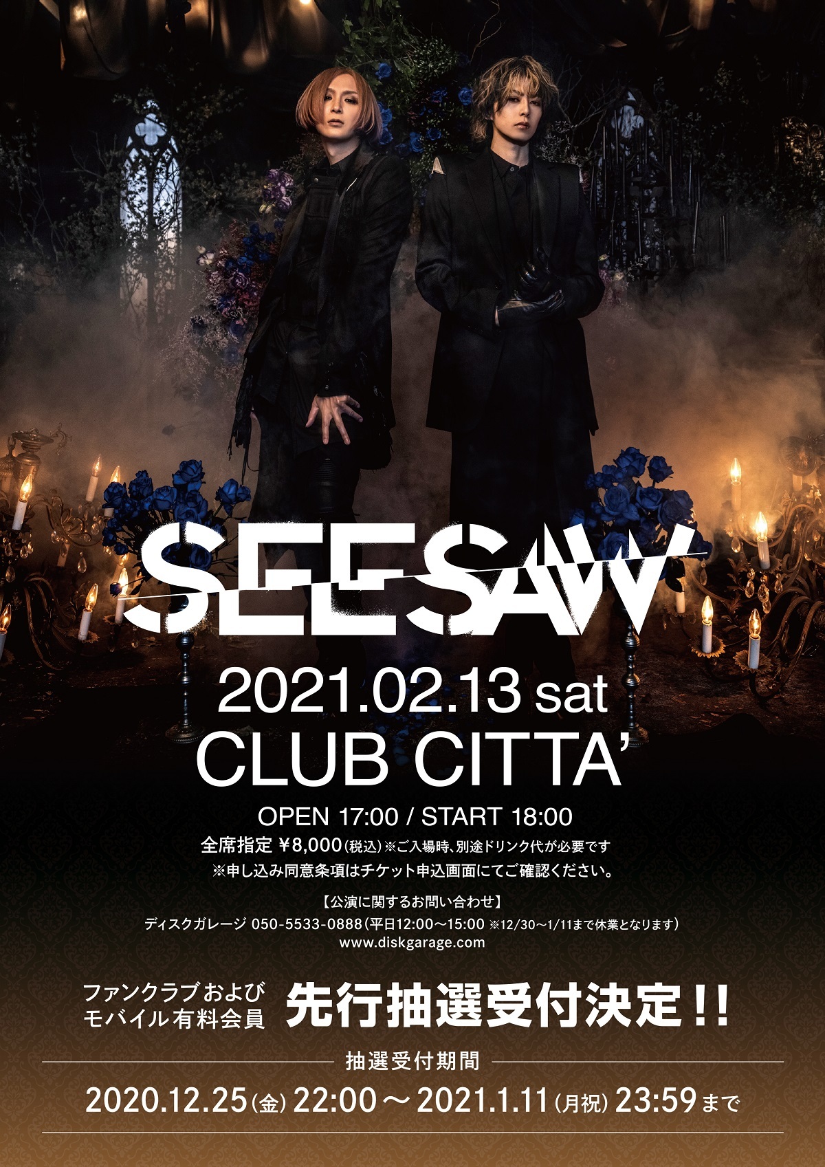 SHINと咲人(NIGHTMARE)によるプロジェクト、SEESAWが本日12月25日、プロジェクトのお披露目となる初ライブ『[scene:00(シーンゼロ)]』を新宿BLAZEで開催した。